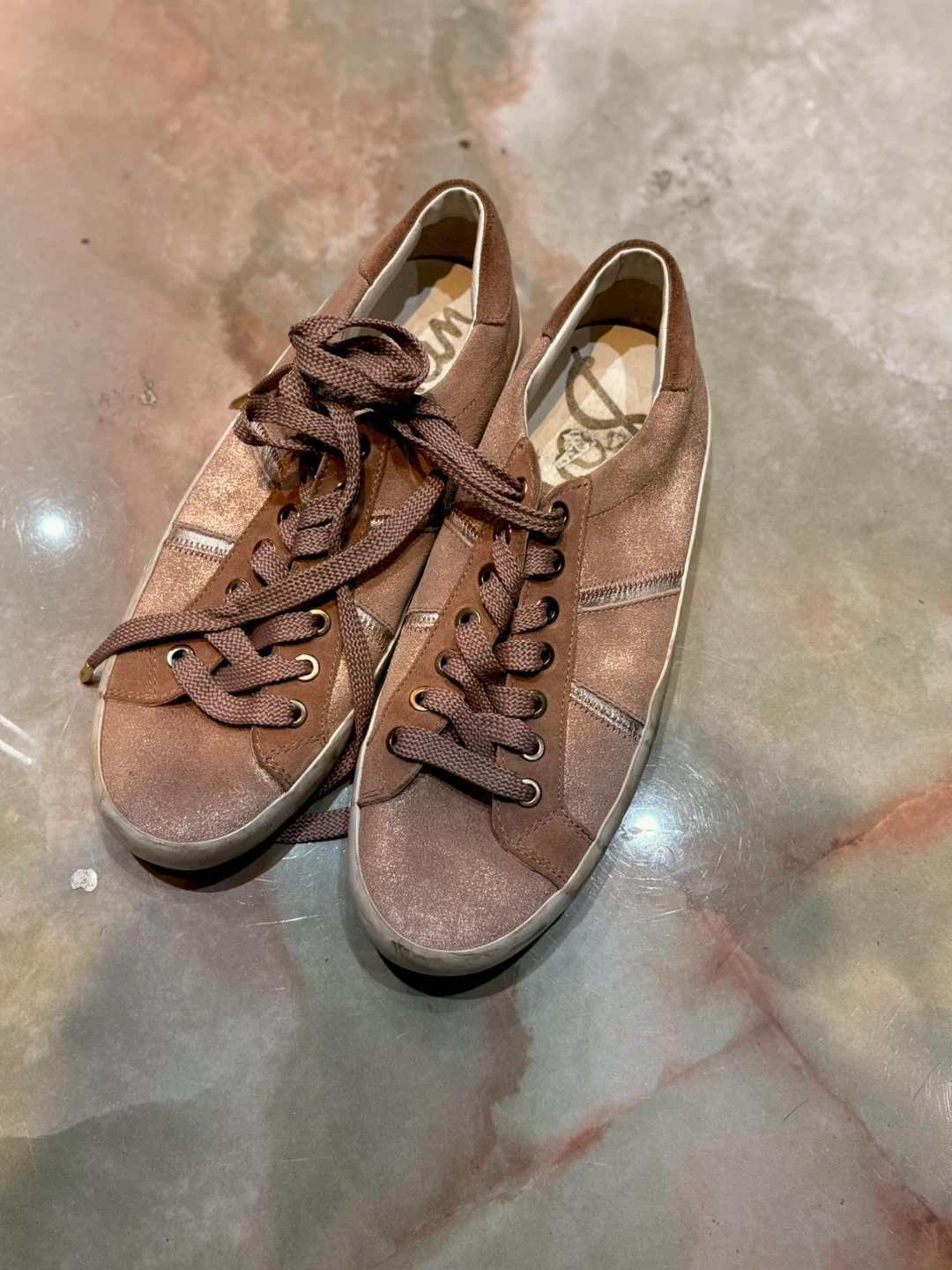 These are a pair of rose gold Sam Edelman sneakers. They have laces and are in good condition!