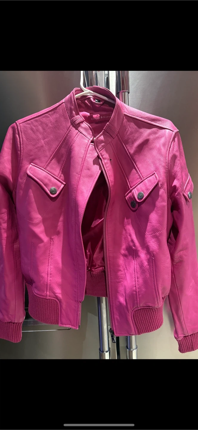 This is a stylish pink leather jacket from Knoles & Carter. It's a vibrant piece that would add a pop of color to any outfit. The jacket features a bomber style with a ribbed collar, cuffs, and hem. It has functional pockets and a zip-up front. Perfect for adding an edgy touch to your wardrobe!