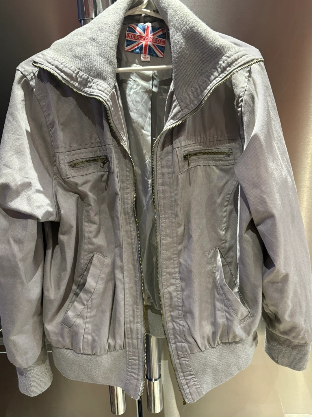 Selling a MISS LONDON jacket in size 2X. It's a stylish gray color and features a zip-up front with multiple pockets. Perfect for adding a cool touch to your outfit!