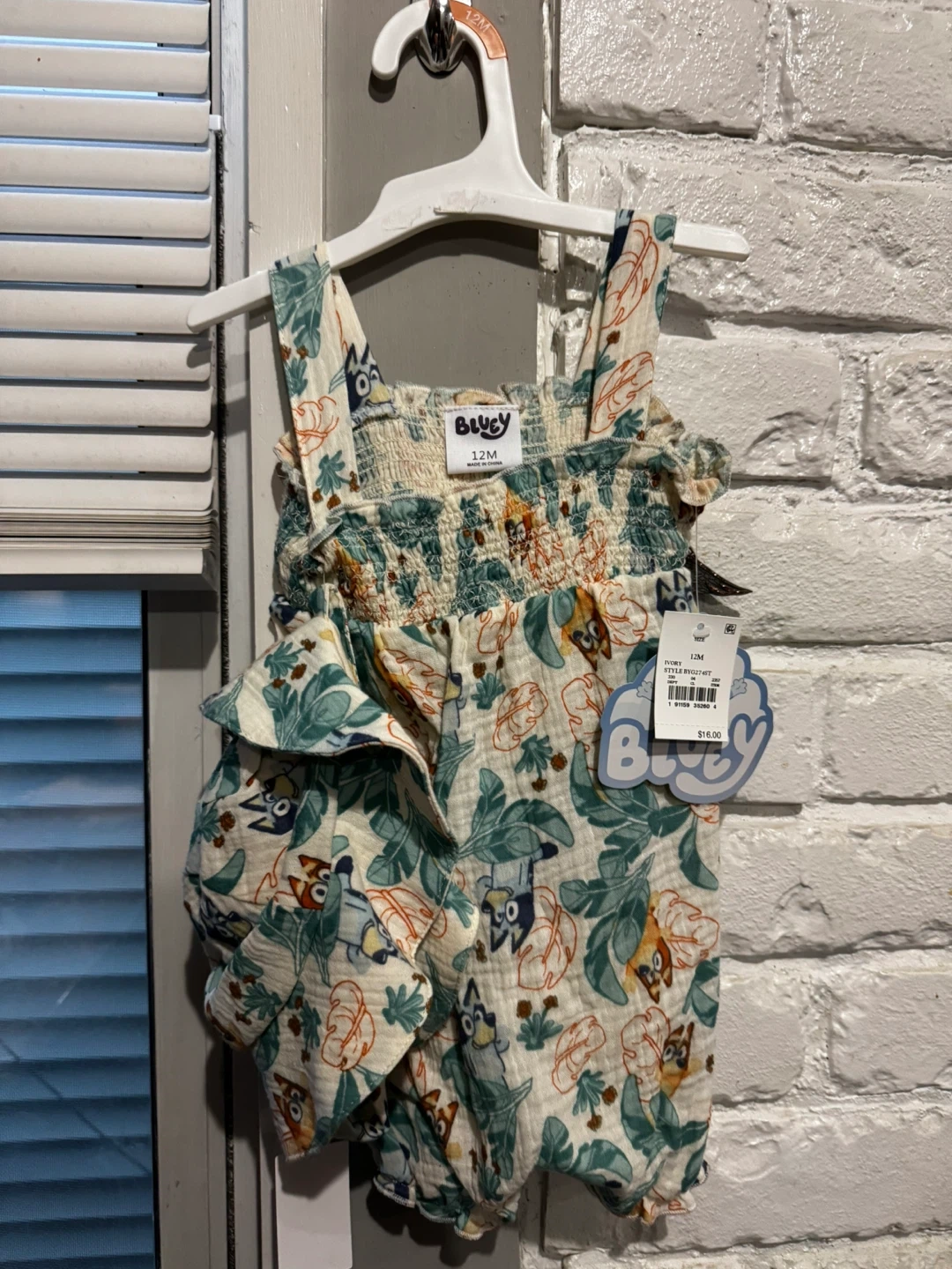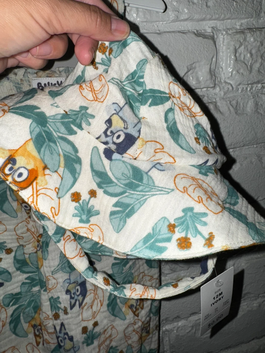 65This adorable Bluey romper and hat set is perfect for your little one! It's size 12M and comes in a lovely ivory color. The material features a fun Bluey character print. The original price was $16.00