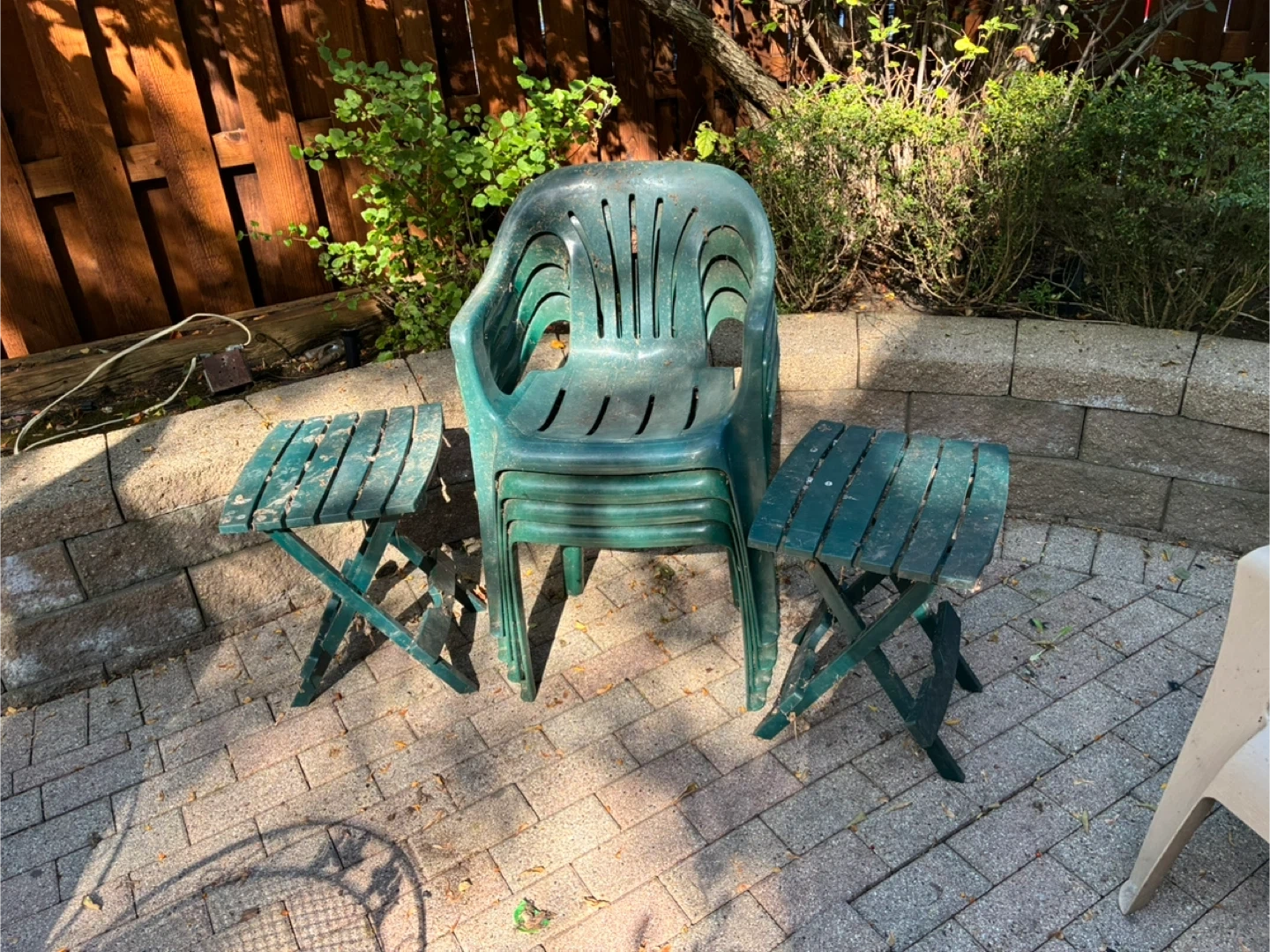 Selling a set of green plastic chairs and matching folding tables. Perfect for outdoor seating or gatherings. The chairs are stackable for easy storage, and the tables are foldable for convenience. Great for patios, decks, or gardens!