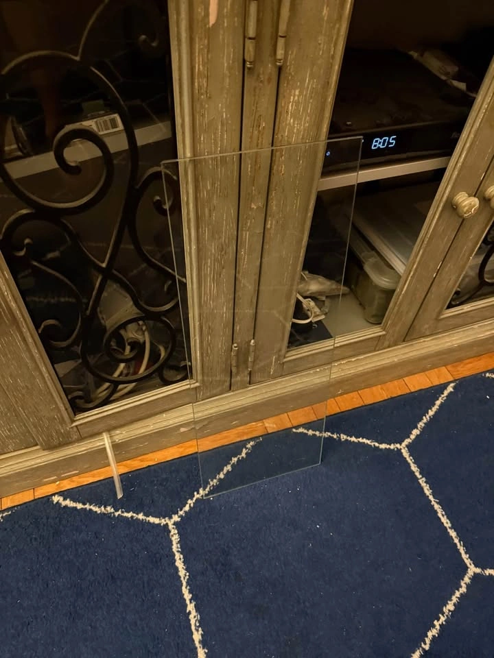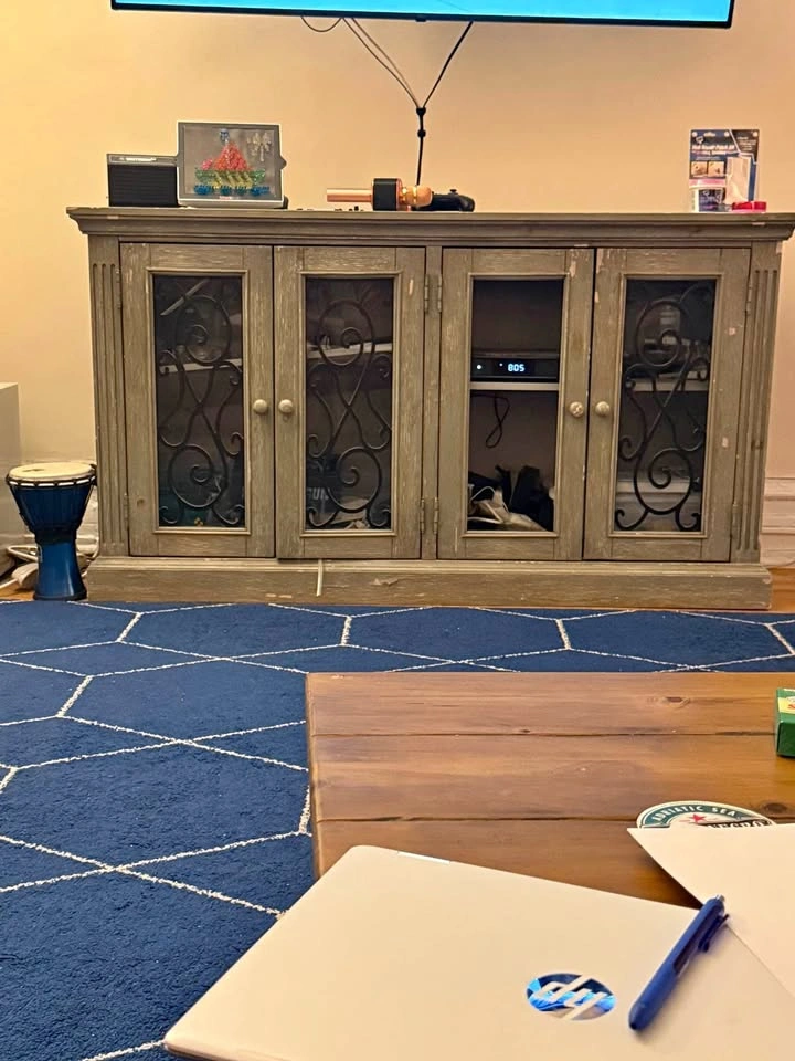 Free cabinet — just needs a new home! It’s a rustic-style wood media console with iron detailing on the doors. The piece shows wear (scratches, chips, and one glass panel is loose), but it’s still sturdy and usable for storage or as a TV stand. Approx. 60” W x 16” D x 32” H Includes two glass shelves (pictured separately). Pickup only – Midtown West.