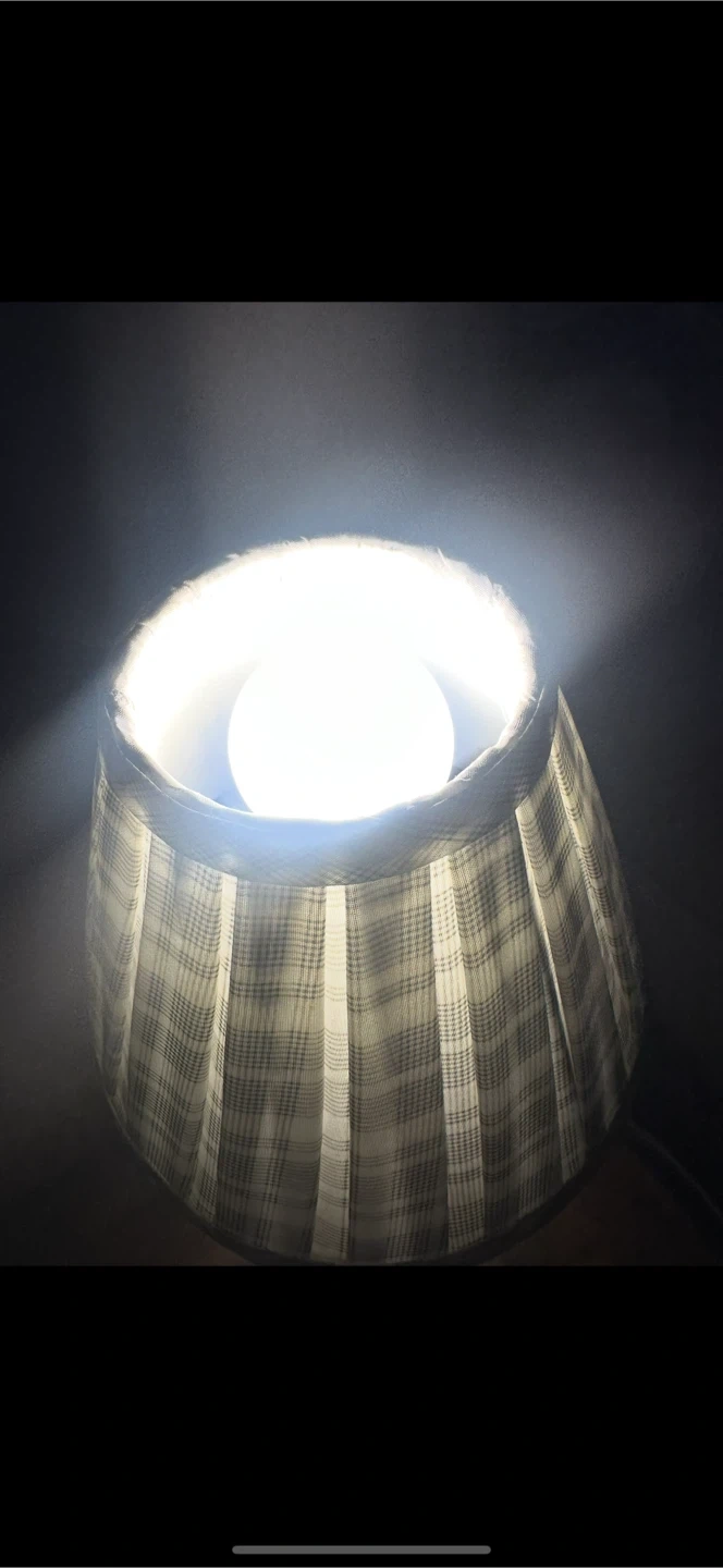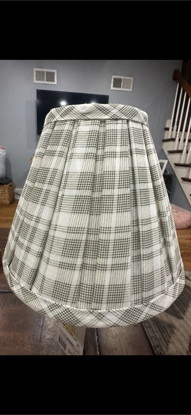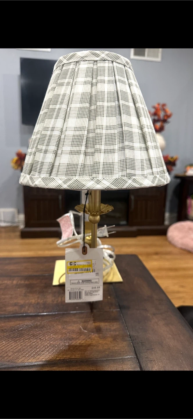 This is a Threshold lamp with a plaid shade and a marble base. Bookshelf lamp • Marble stand with metal base plaid lamp shade ( picture above with white shade is a comparison from online) • 5ft cord length • Electric power source
