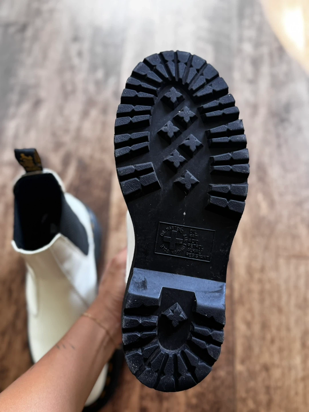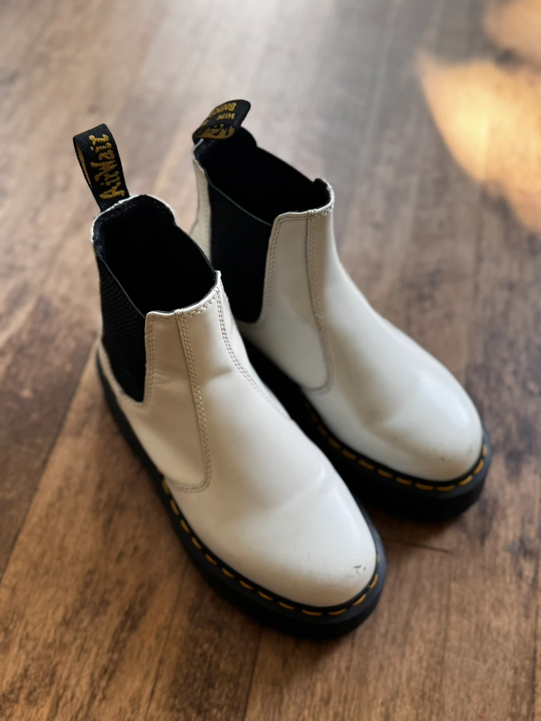 65Wore ONCE! Selling a pair of Dr. Martens 2976 Quad Chelsea Boots in white! These are a US size 5. They have a platform sole for a bit of extra height and a classic Chelsea boot style.