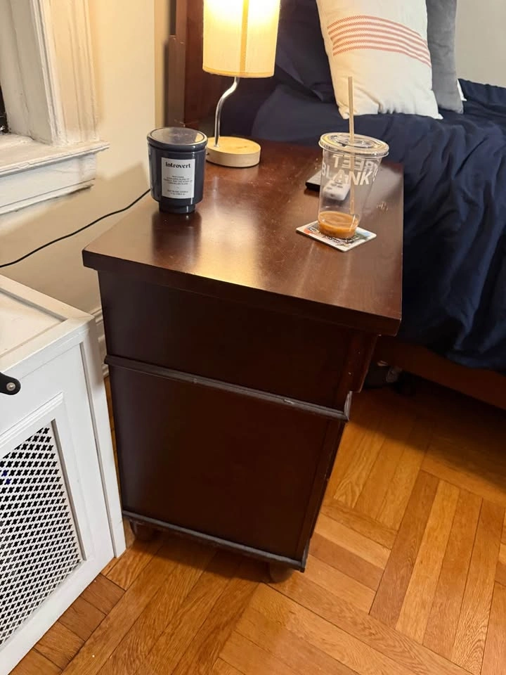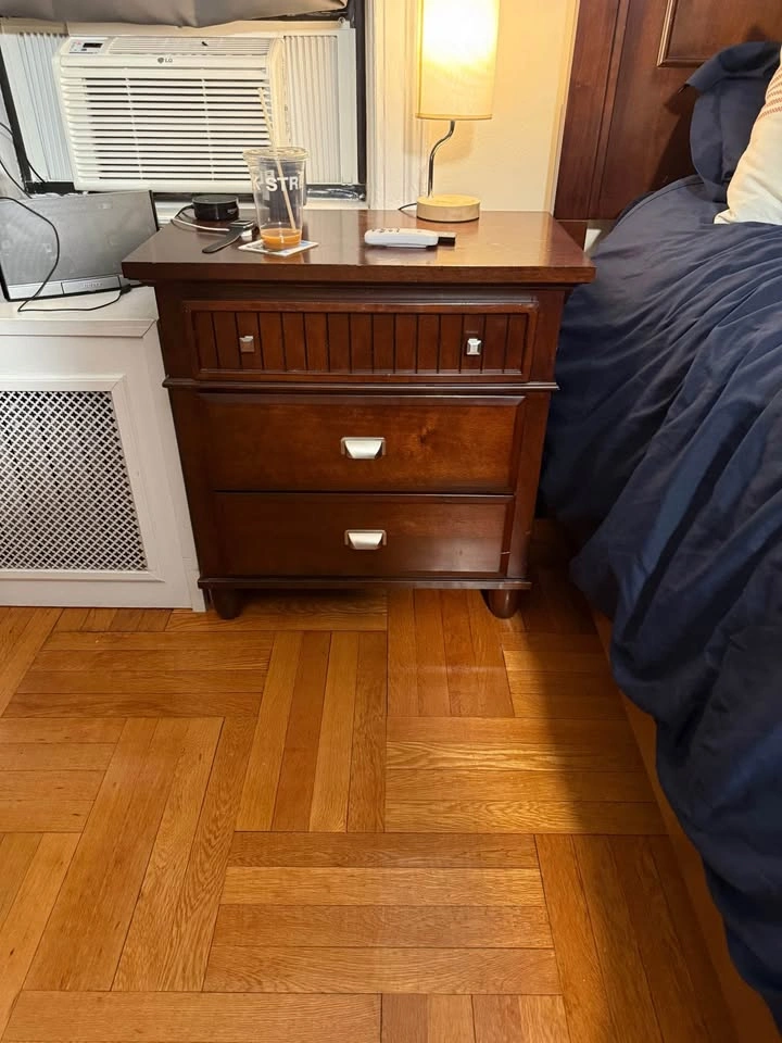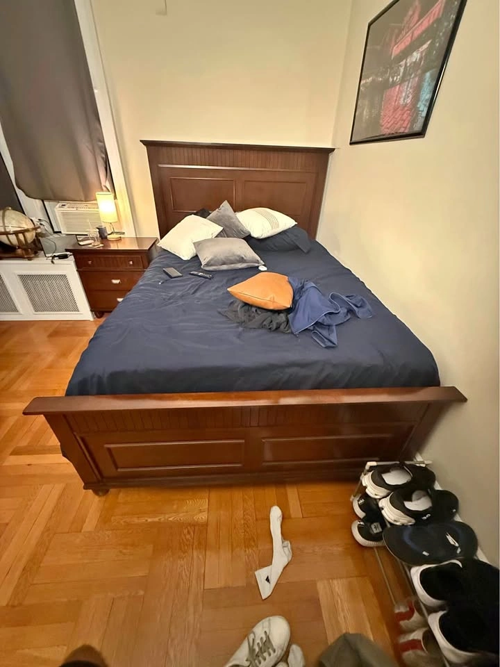 Selling a classic, solid wood queen-sized bedroom set. This includes a sturdy Headboard and Footboard, a matching nightstand, and a split queen box spring. This is a great deal for someone furnishing an apartment or needing a quality, solid wood set. What's Included: 1. Queen Sized Wood Bed Frame: Dark brown finish. Includes the full frame: Headboard, Footboard, and side rails. In good used condition. 2. Matching Nightstand: Dark brown finish with drawers for storage. 3. Queen Split Box Spring: The box spring comes in two pieces (split queen) which makes it MUCH easier to move through NYC doorways and stairwells! (Mattress NOT included). Dimensions: • Frame/Box Spring: Fits a standard Queen-sized mattress. • Nightstand: [Estimate dimensions Approx. 20" wide x 16" deep x 25" tall] Why Buy: The box spring alone is a huge plus, and the heavy-duty wood frame is built to last! PICKUP REQUIREMENTS (Midtown West): • Price is firm at $250. Selling all three pieces as a bundle only. • Local Pickup ONLY in Midtown West (near [Cross Street or Landmark]). • The frame will be disassembled for easier transport. • You MUST bring your own help and a suitable vehicle. We are unable to assist with moving/loading. Please ensure you can get the box spring (2 pieces) and all frame parts out.