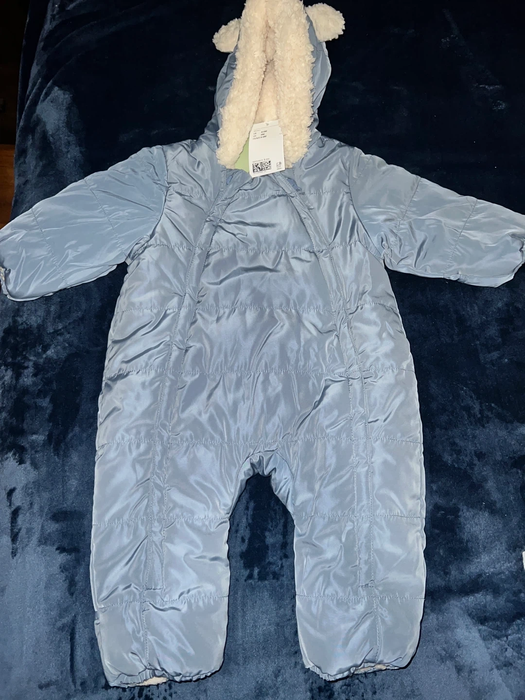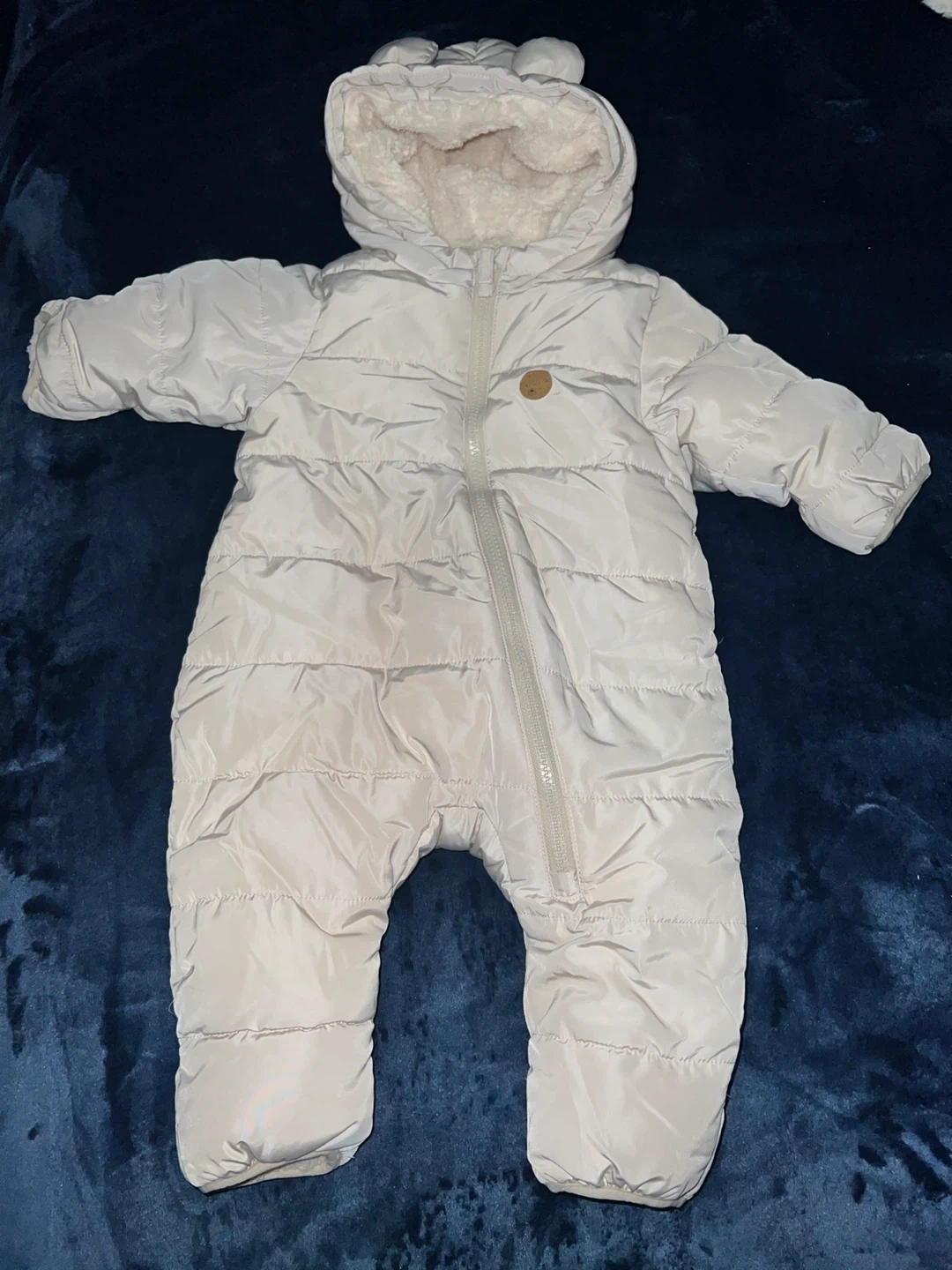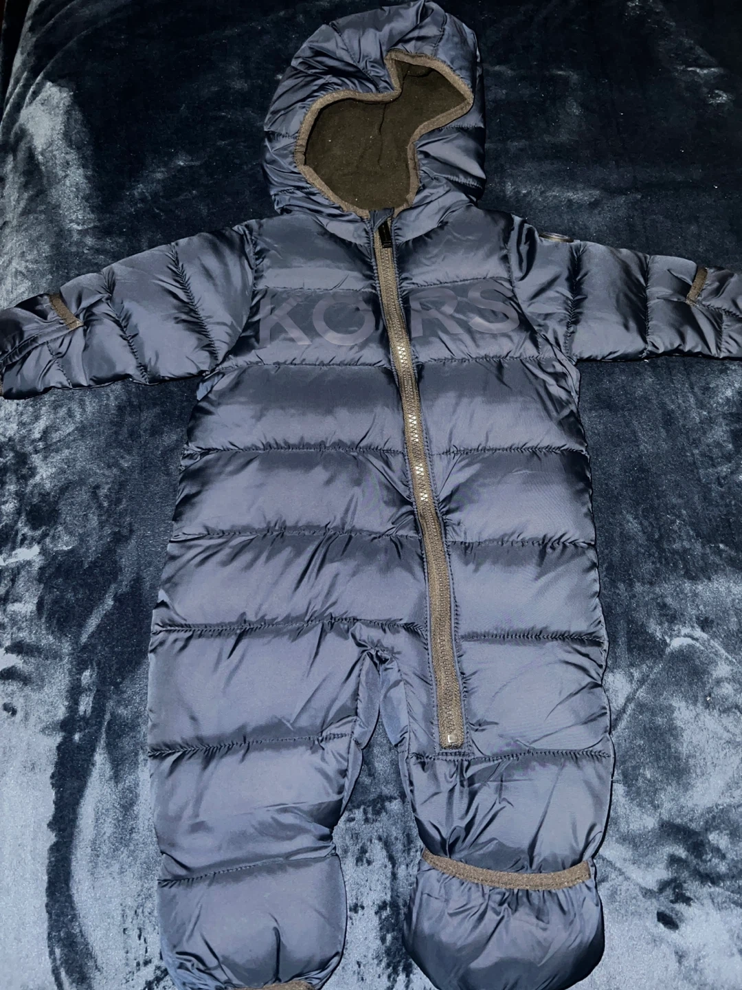 A collection of baby snowsuits and rompers. These are perfect for keeping your little one warm and cozy during the colder months. They are in good condition and ready for a new home! They come in a variety of colors and styles, including a Michael Kors snowsuit.