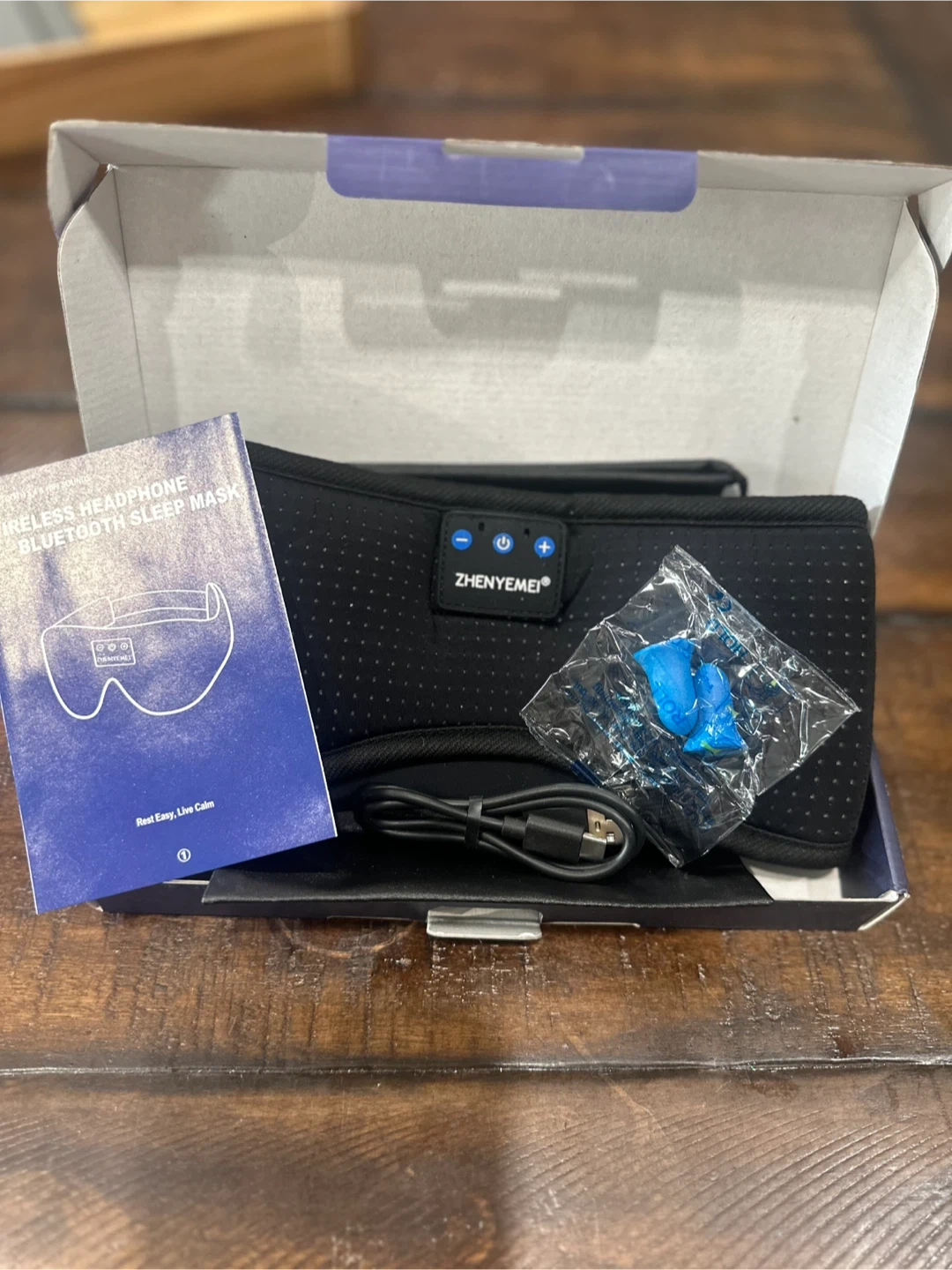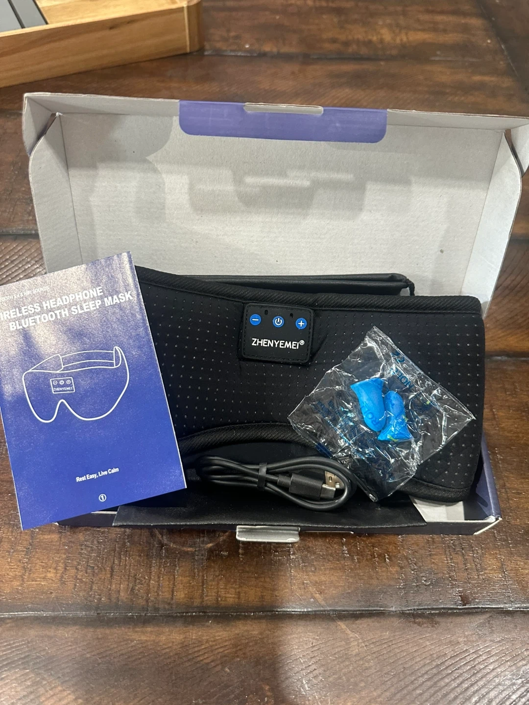Selling a brand new Zhenyemei wireless headphone Bluetooth sleep mask! It comes with the original box, instructions, charger, and earplugs. Get ready to rest easy and live calm!