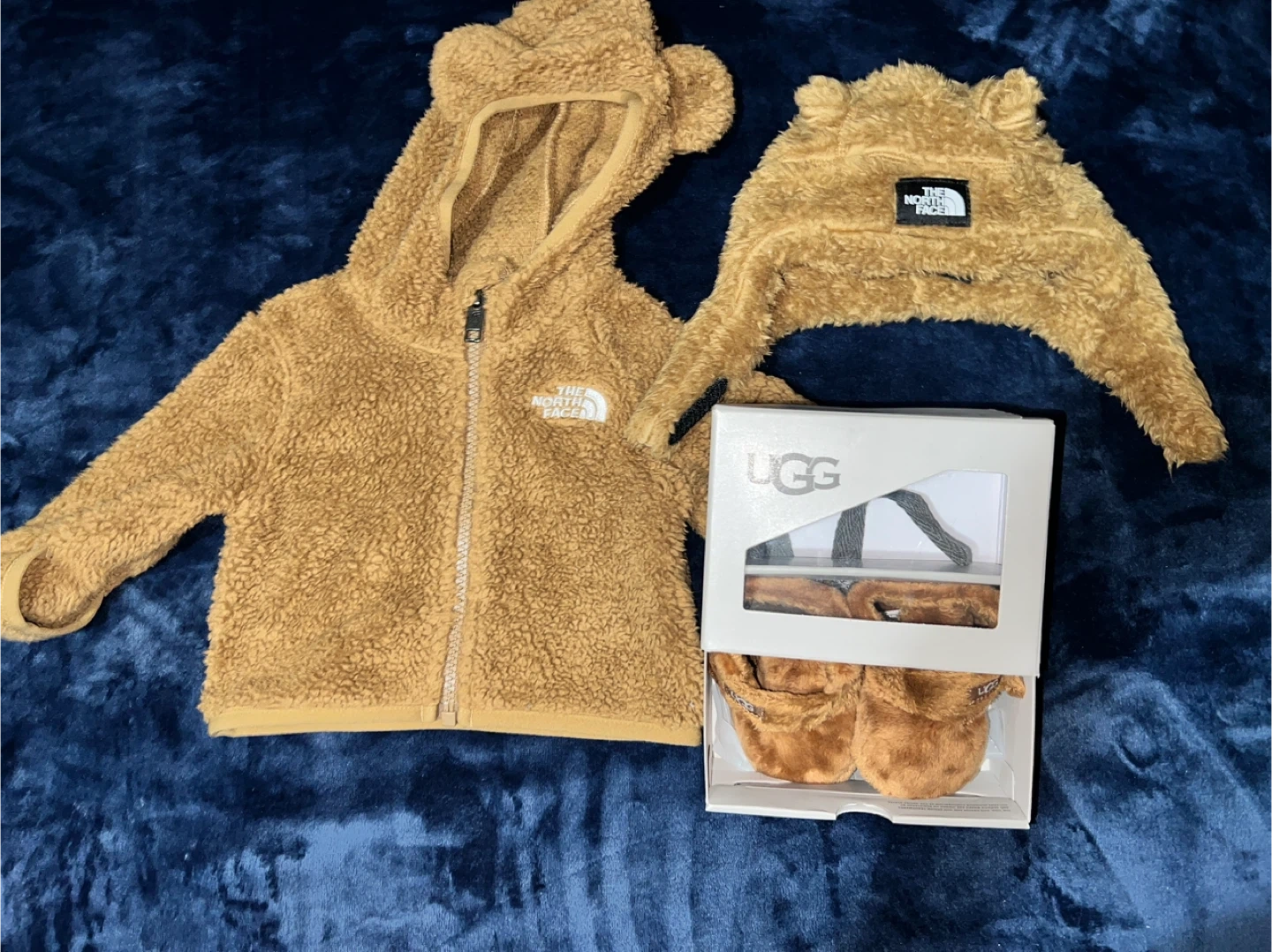 Super cute set for your little one! It includes a North Face bear hoodie and hat, both in a soft, fuzzy material. Also included is a pair of UGG baby booties in their original box