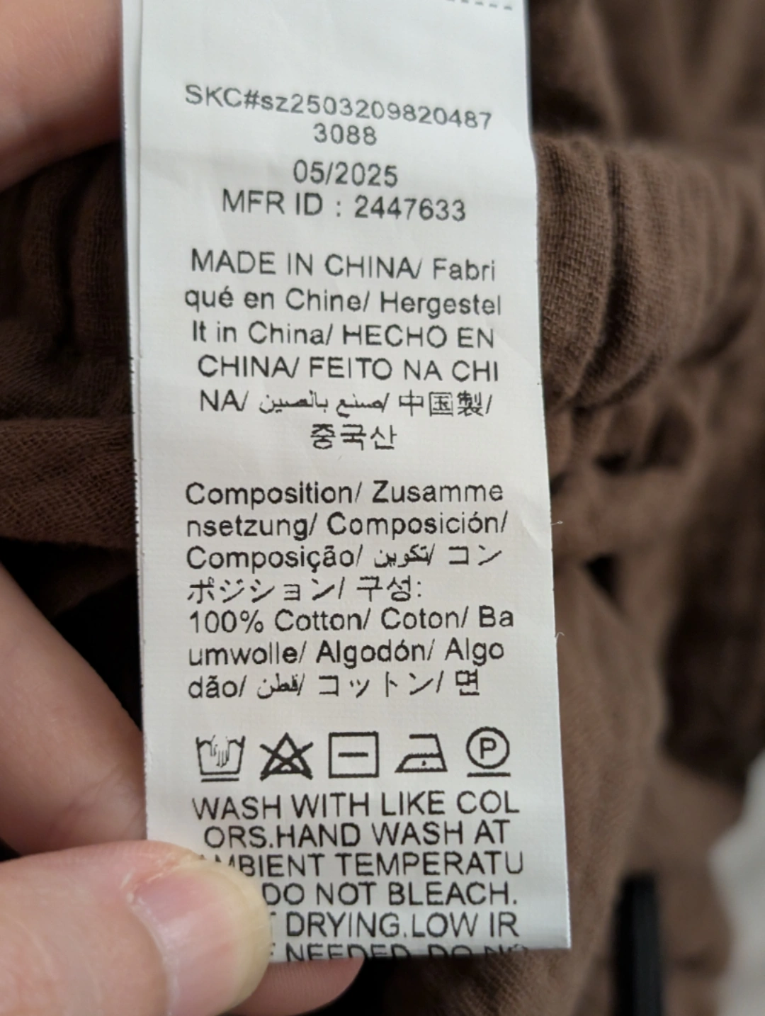 These are a pair of brown, wide-leg pants from Shein. They're made of 100% cotton and are a size XL. They have an elastic waistband with a drawstring. The manufacturing date is May 2025.