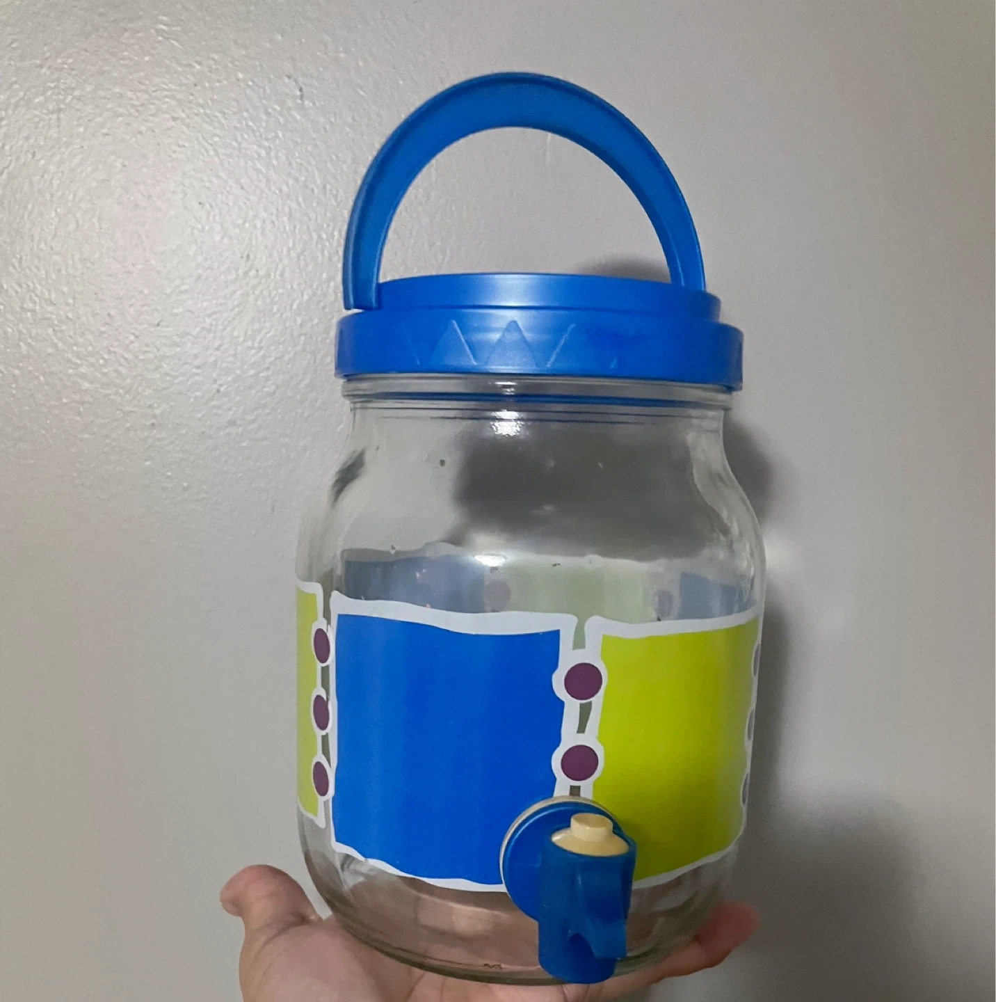 Selling a glass beverage dispenser with a spigot! It's perfect for parties, picnics, or just keeping your favorite drinks on hand. It has a blue handle and a fun, colorful design on the front. It's in great condition and ready to use