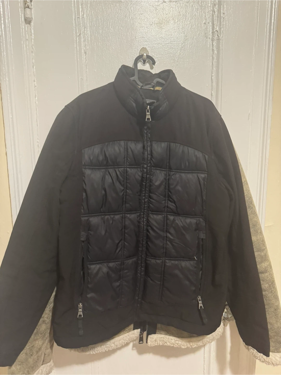 128Selling a black puffer jacket. It's in good condition and has a stylish design with a quilted front panel. Perfect for staying warm during colder weather!