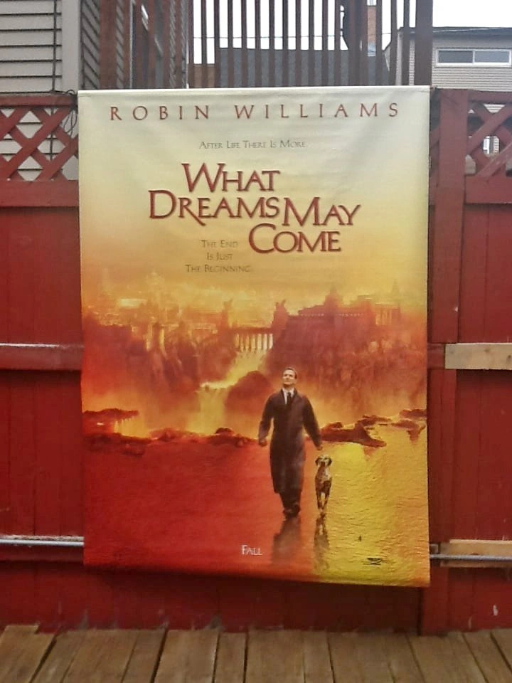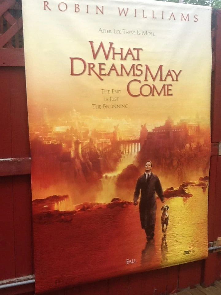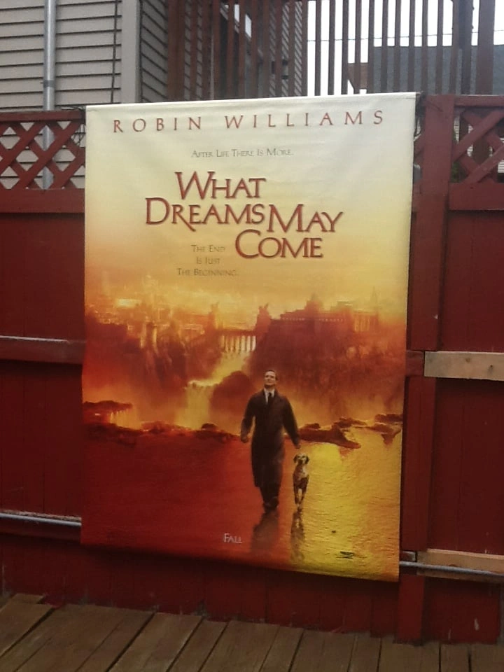 Giant vinyl movie lobby banner for "What Dreams May Come" (1998). Measures 67 x 47 inches on heavy vinyl material and features the same image on both sides. These were only distributed to select movie theaters and are extremely rare. Won the academy award for best visual effects. Item is in like new condition and ready for display with a wooden rod and two mounts included. From a smoke and pet free home. Check out in person before purchasing. Thanks for looking!