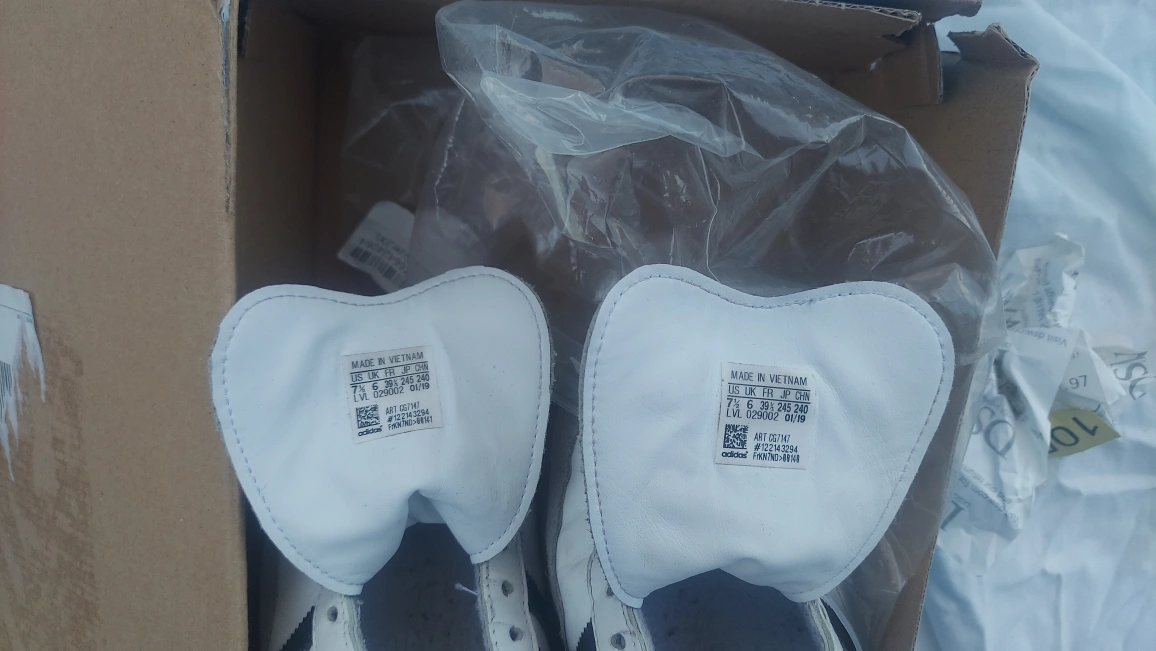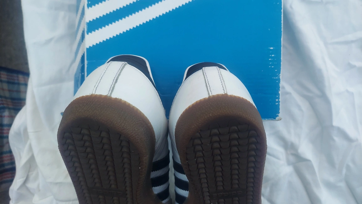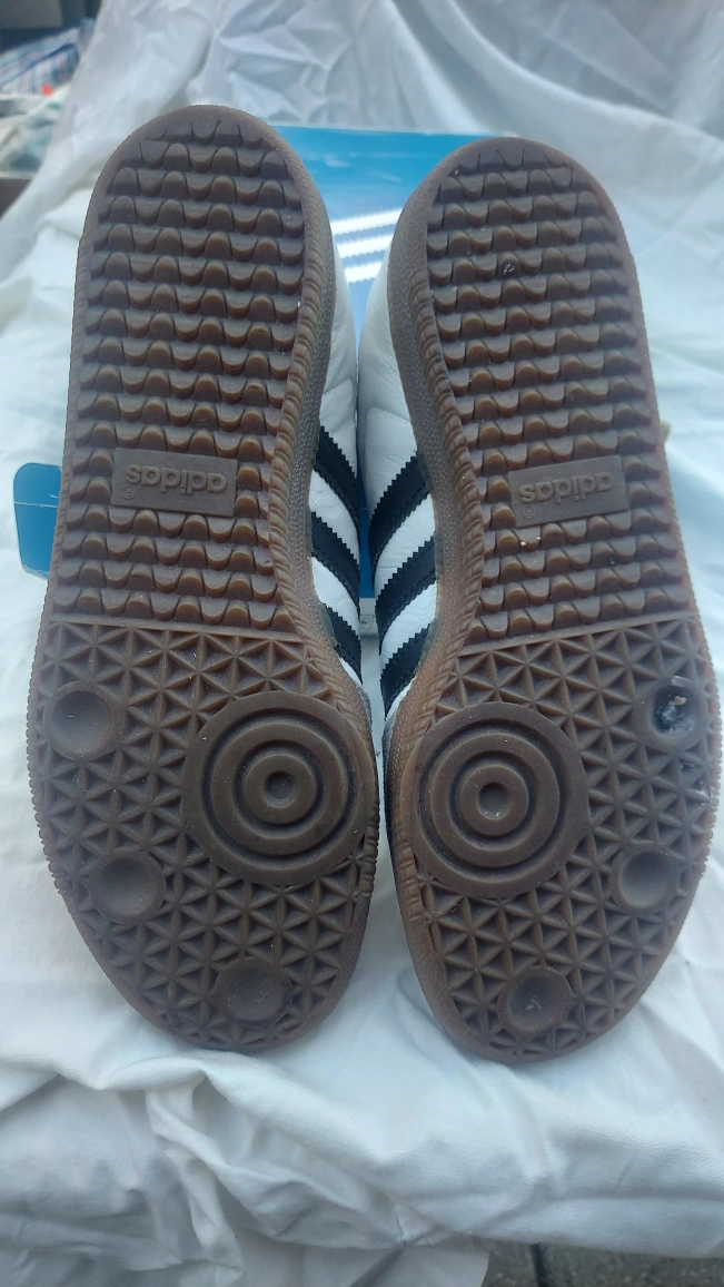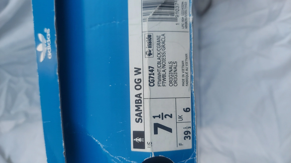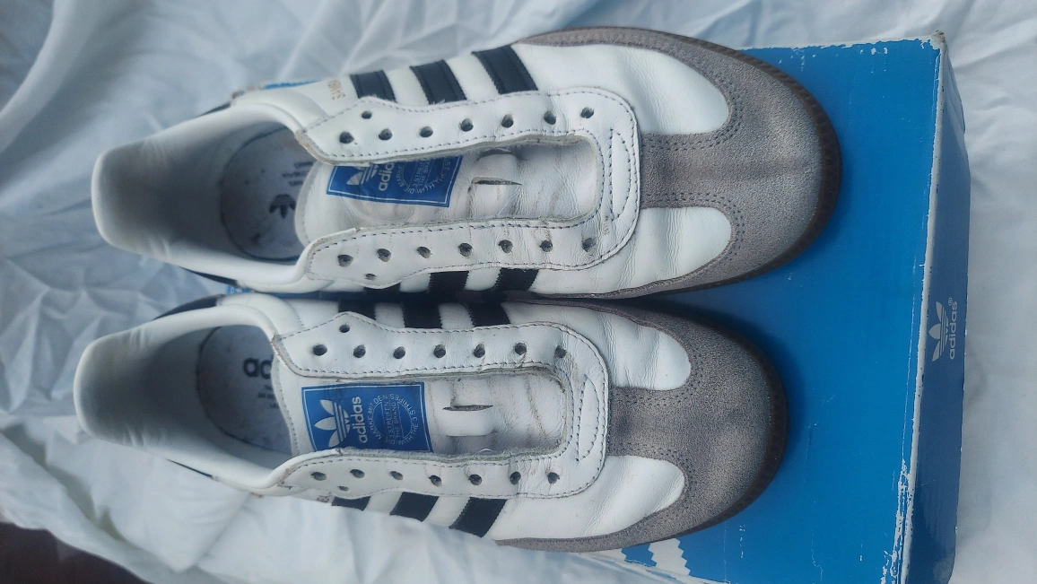 119Selling a pair of Adidas Samba OG W sneakers in white and black, size US 7.5. These classic shoes are in fair condition and ready for a new home! The model number is CG7147. Comes with the original box. Please view all photos closely.