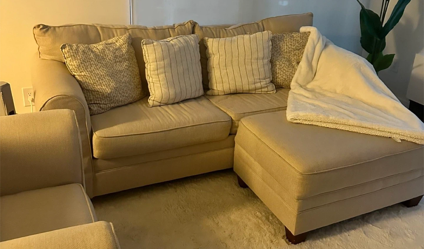 Selling a comfy beige sofa with a matching ottoman that has hidden storage! It's perfect for storing blankets or extra pillows. The sofa and ottoman are in good condition and would be a great addition to any living room