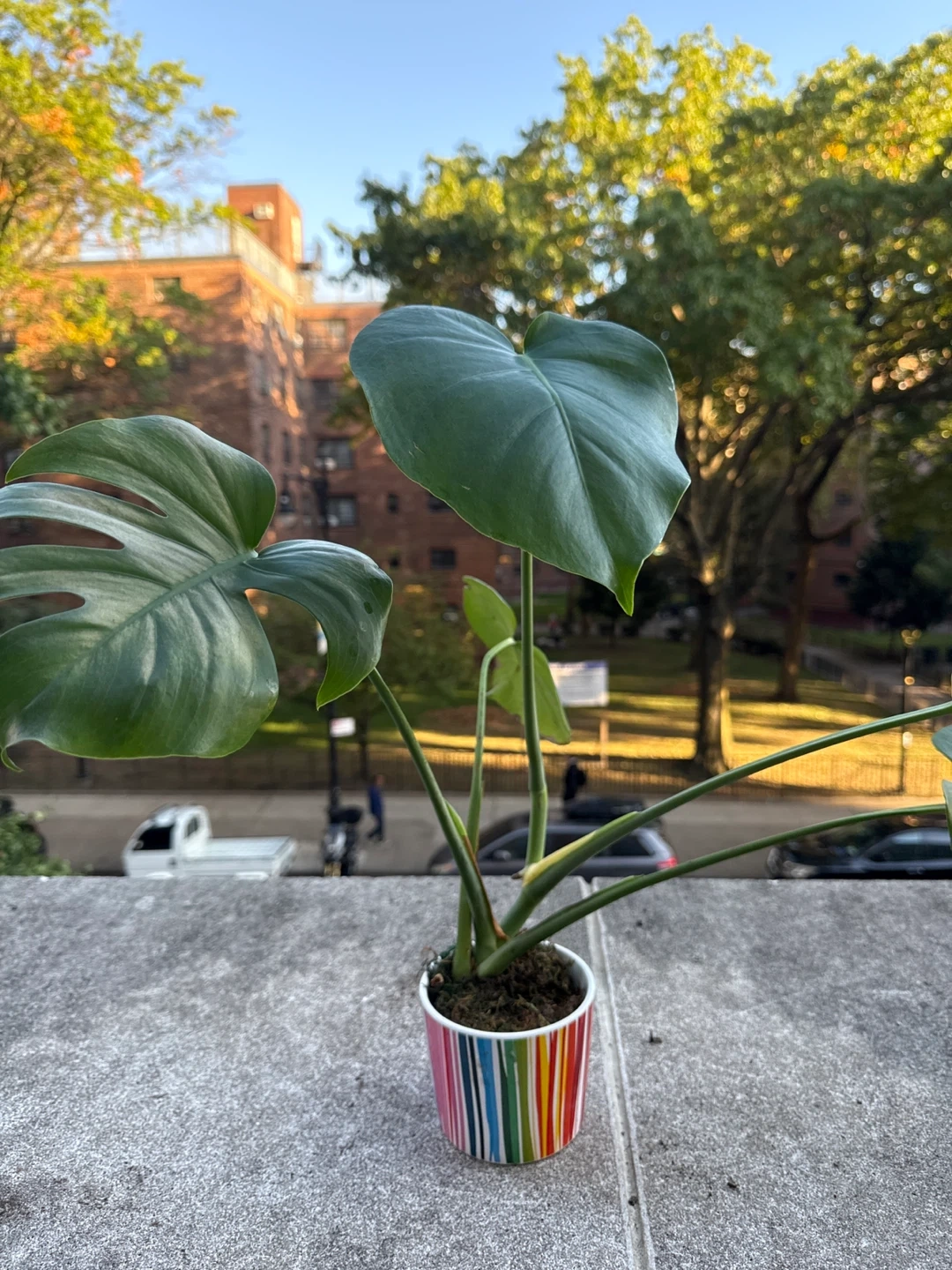 Selling a monstera plant! It's currently potted in a colorful striped pot and ready to brighten up your space. Plant currently reaches about 24” wide and 19” tall