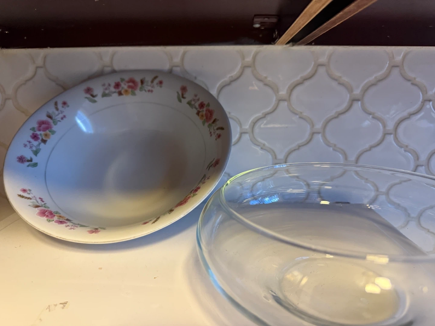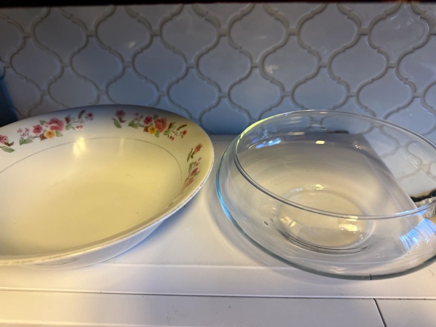 334Two bowls for sale. One is porcelain with floral design and the other is glass