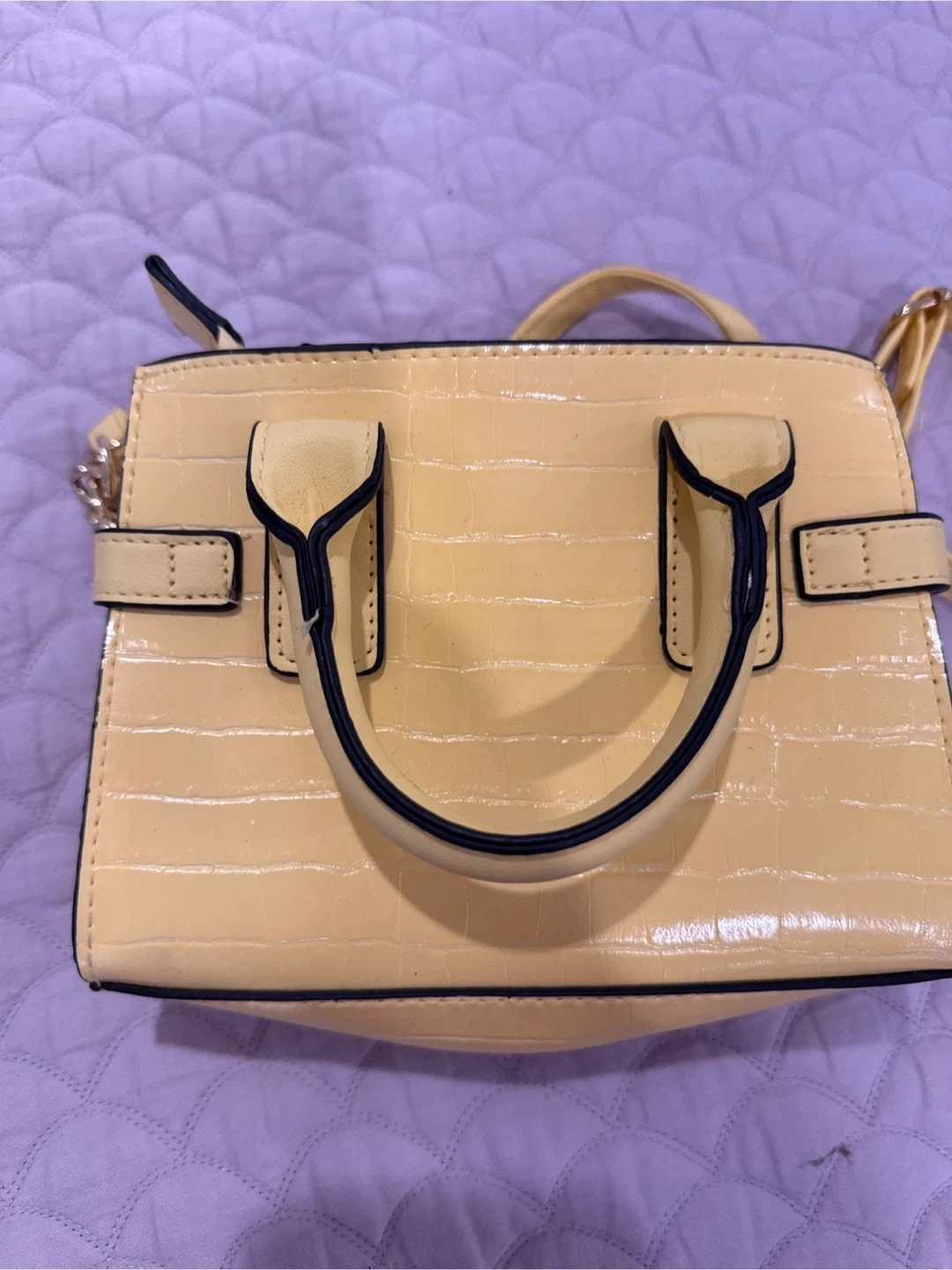 25This is a cute yellow handbag with a croc-embossed texture. It has a top handle and a detachable shoulder strap, so you can carry it in different ways. The bag is in great condition and perfect for adding a pop of color to your outfit