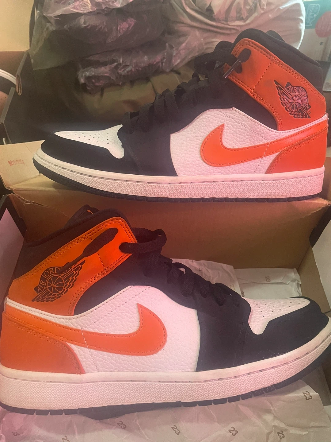 Selling a pair of Air Jordan 1 Mid sneakers in black, starfish orange, and white. These are size 9 US. The box is included!