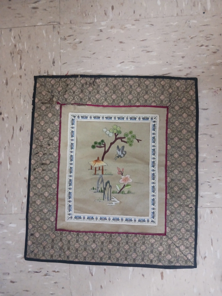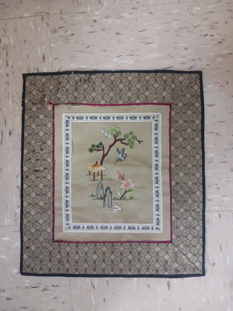 vintage Asian embroidery cloth. It features a beautiful nature scene with a tree, flowers, and a butterfly, all intricately embroidered. The piece is framed with a patterned border. It's a unique and lovely piece