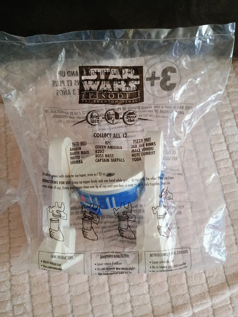 I have a set of Star Wars Episode I: The Phantom Menace collectible cup toppers still in their original packaging! This set includes characters from Taco Bell, KFC, and Pizza Hut. Collect all 12!
