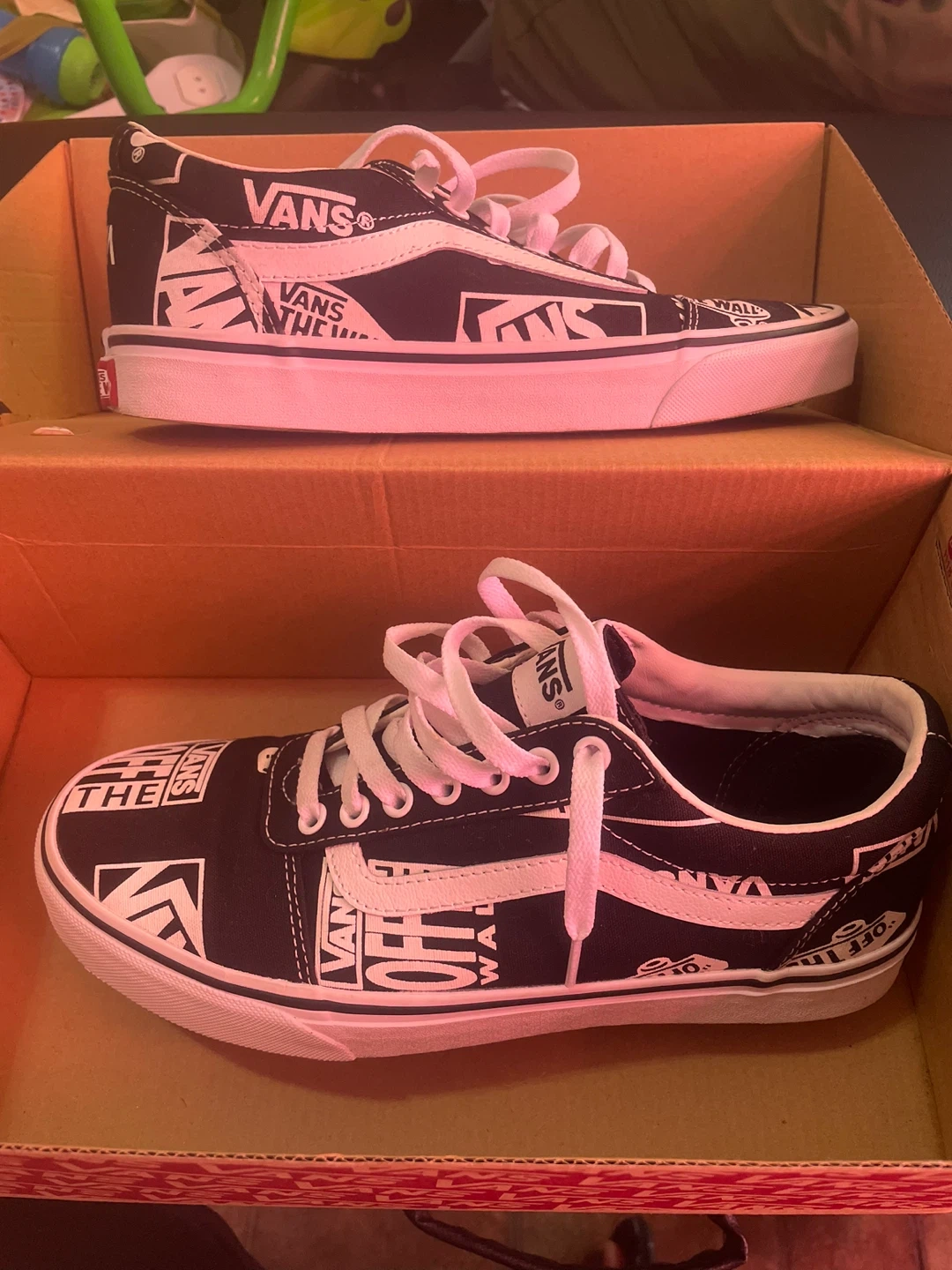 Selling a pair of Vans Ward (Logo Mix) in black and white, size 8.5 US men's. The shoes are in great condition and come with the original box!