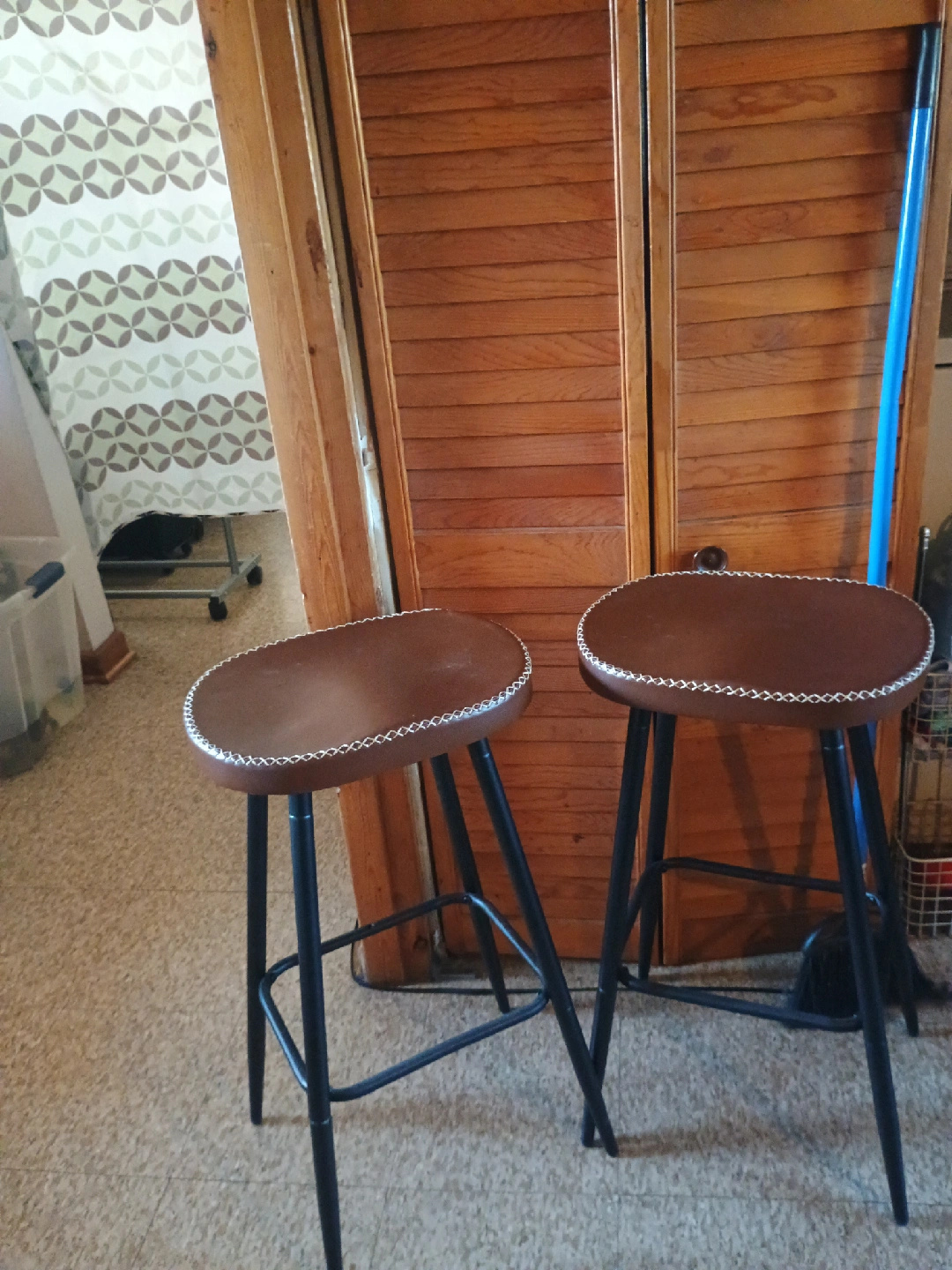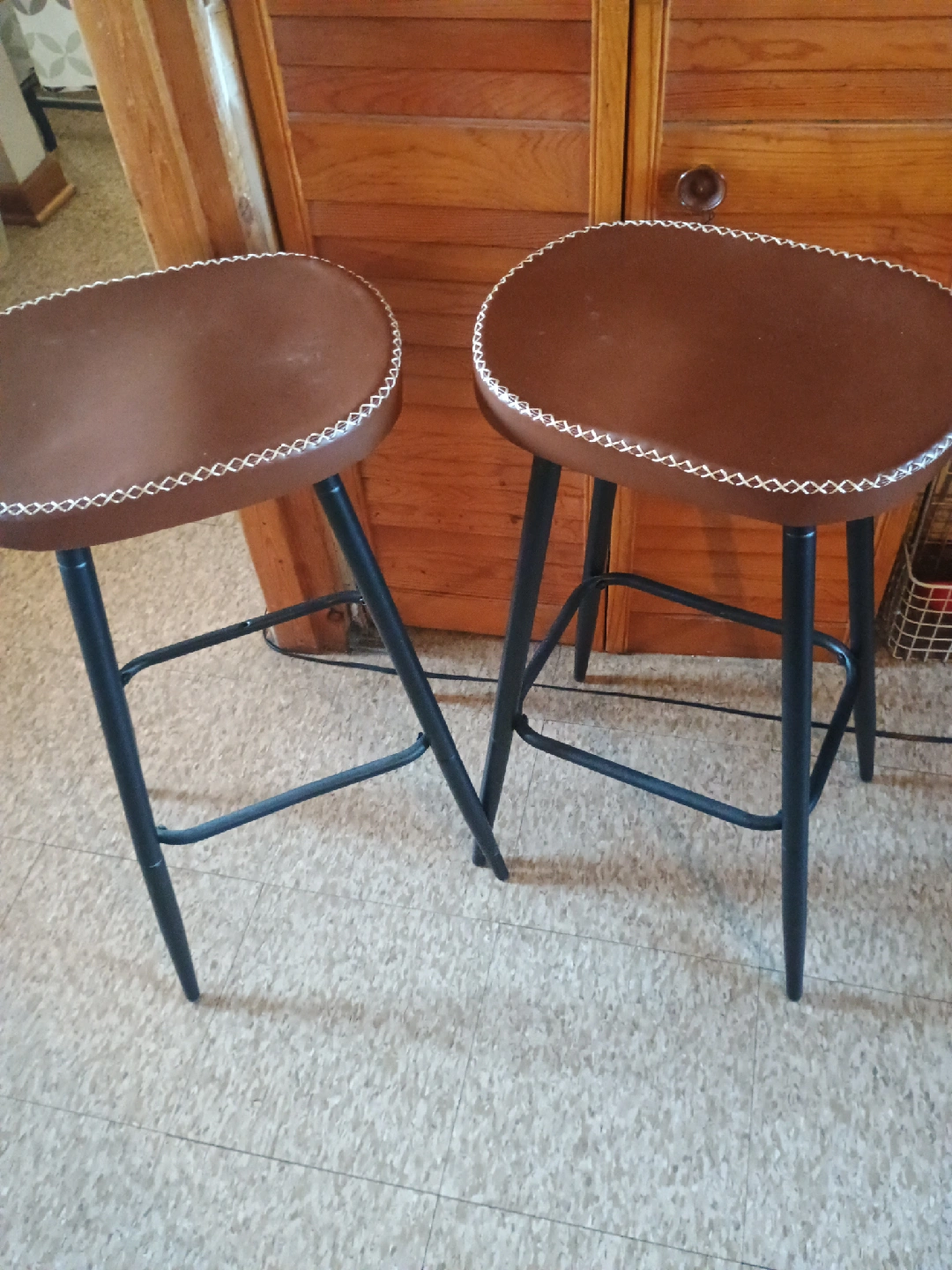 Selling a set of two bar stools. They feature a brown seat and black legs. Great for adding a stylish touch to your kitchen or bar area