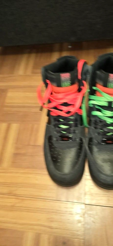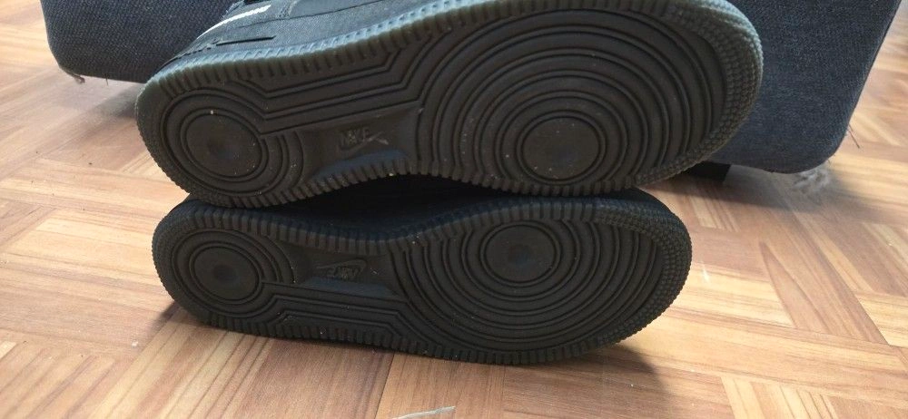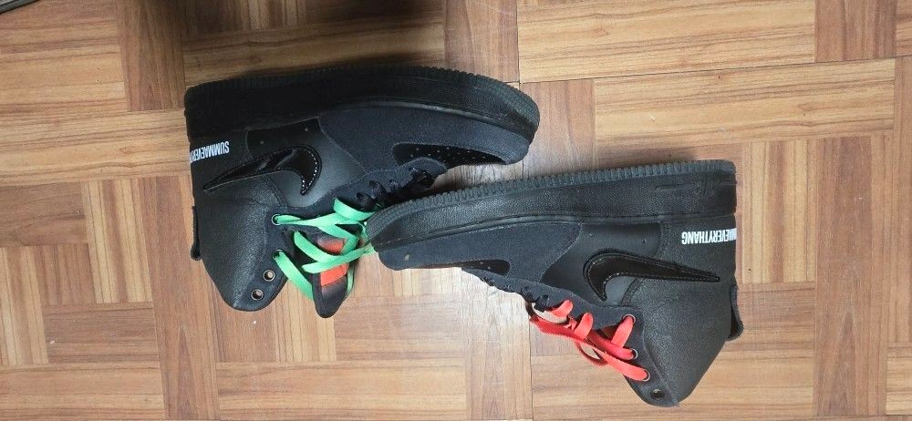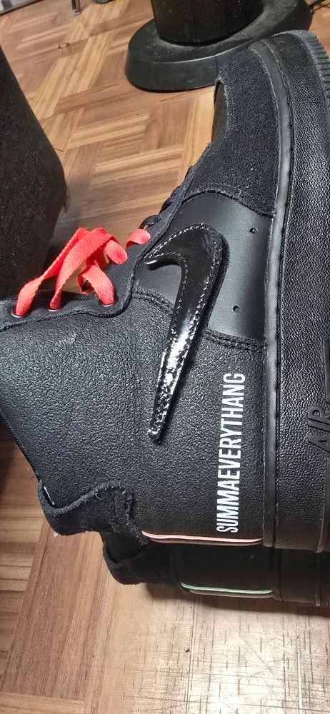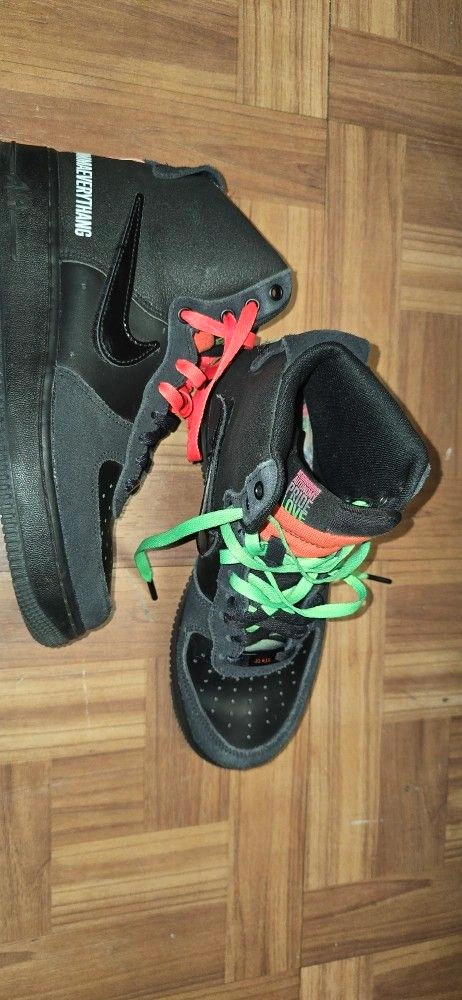 10NIKE AIR FORCE 1 X LAUREN HALSEY HIGH 07 LE "ALL FOR 1" SIZE 7. No box. Creative artist Lauren Halsey nods to her Los Angeles background with the Nike Air Force 1 High '07 LE 'ALL FOR 1' offering. Released in December 2019, the sneaker shows off a triple-black palette on the dual-textured leather and suede upper. Distinctive flourishes emerge thanks to a detachable strap, glossy Swooshes, and a hand-lettered dubrae. Asymmetrical laces and a collage on the insole speak to the energy of South Central. Reflective heel text and a duo-colored rubber cupsole add the final touches. Size: 7 Color: Black Brand: NIKE AIR FORCE 1