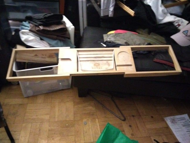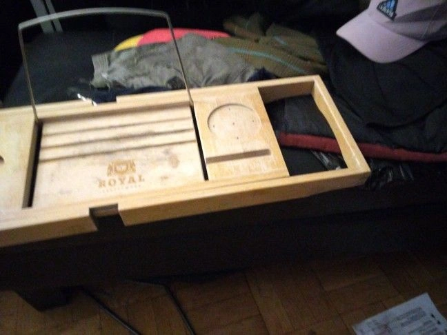 PLEASE READ FULL DESCRIPTION & VIEW ALL PHOTOS CAREFULLY. This item is a project piece and is being sold AS-IS. This is an authentic expandable bamboo bathtub caddy from the popular brand Royal Craft Wood. When restored, it's the perfect luxury accessory for a relaxing spa bath at home. All the original features are here: the adjustable sides to fit your tub, the flip-up metal rack for a book or tablet, the dedicated slot for a wine glass, and trays for your phone or soap. Condition: This caddy is being sold as a project for a DIY-er. It is structurally sound (the sides extend and the rack flips up), but it has significant cosmetic wear from use. As seen in the photos, there are extensive water stains and what appears to be mildew/mold. It will require a thorough cleaning, sanding, and refinishing with a new coat of water-safe sealant to be restored. This is a great opportunity for someone who enjoys restoring wood items and wants a high-quality bath tray for a fraction of the price. Brand: Royal Craft Wood Material: Bamboo Features: Expandable, Book/Tablet Holder, Wine Glass Slot Condition: Used; For Repair/Refinishing. Grab a great deal if you're up for a rewarding restoration project! Color: White Brand: Royal Craft Wood