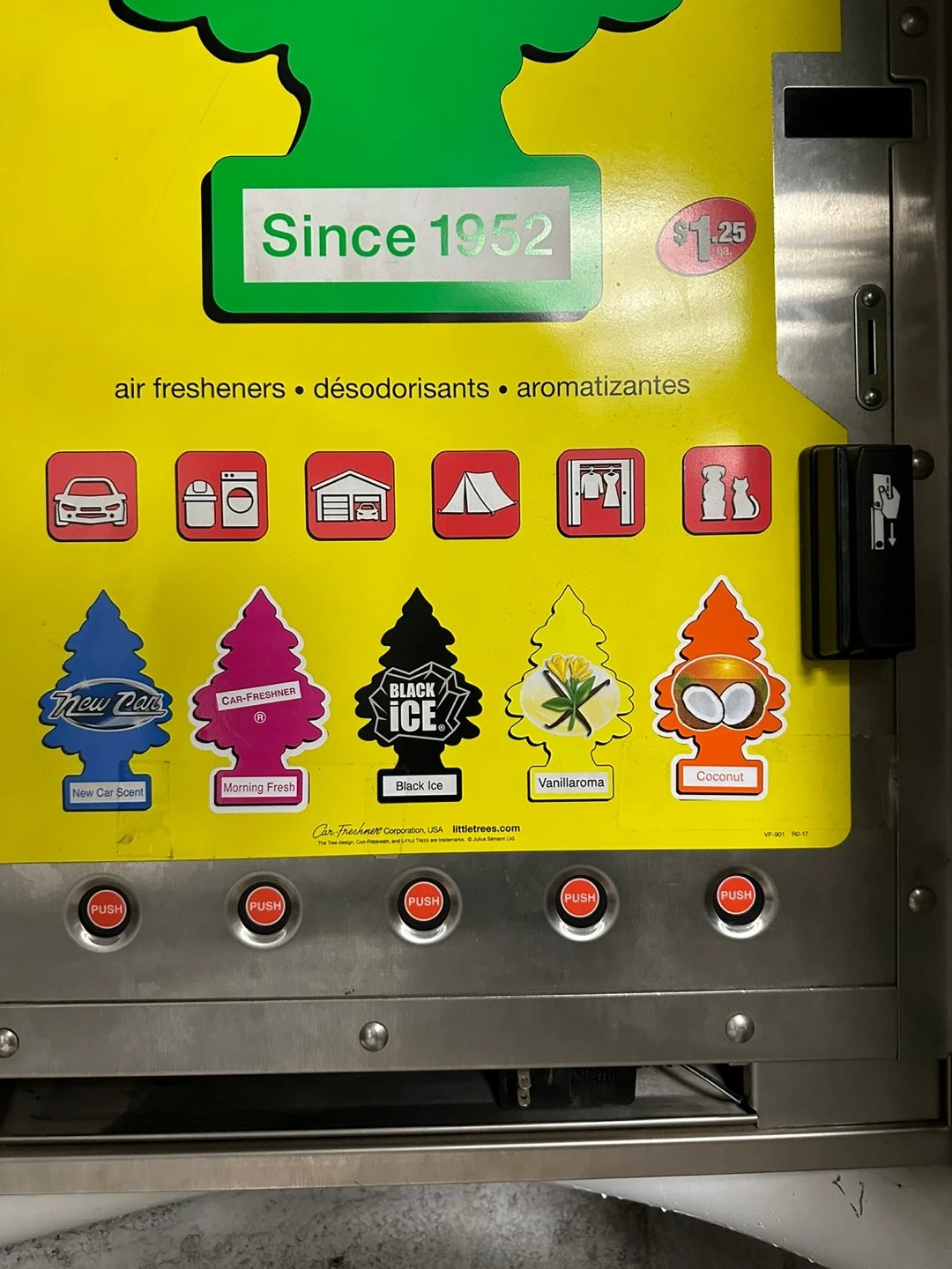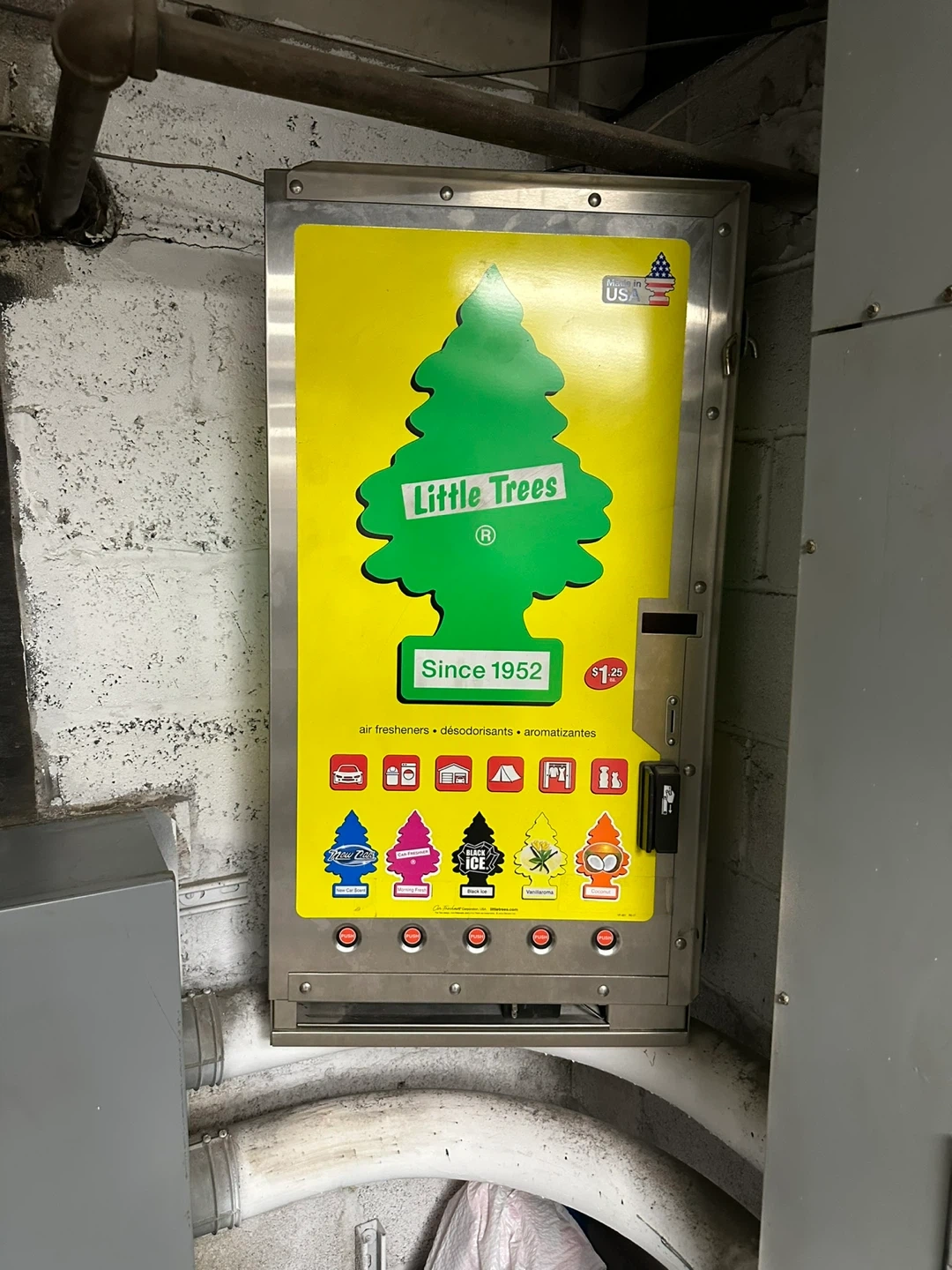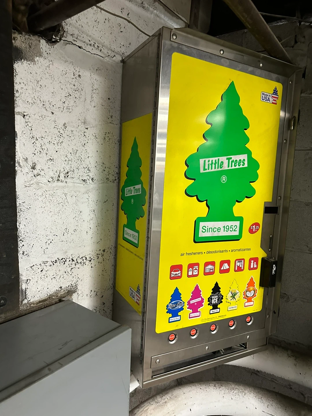 65Little Trees Mechanical Drop Shelf Vender Cabinet with Security Bar Purchased new for $2,260 Local Pickup only at North Bergen Buick GMC Manufacturer Part #UVM90000 Brand: Laurel Metals, Inc. Coin mechanism adjusts from 25¢ to $9.75 Dimensions: 41in H x 21in W x 11-1/2in D Vending Capacity: 180 total shelves Material: Stainless Steel cabinet, door, and security frame Dispenses (864) Little Trees® Air Freshners