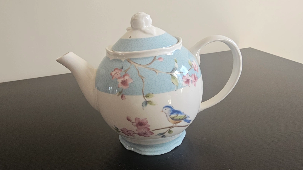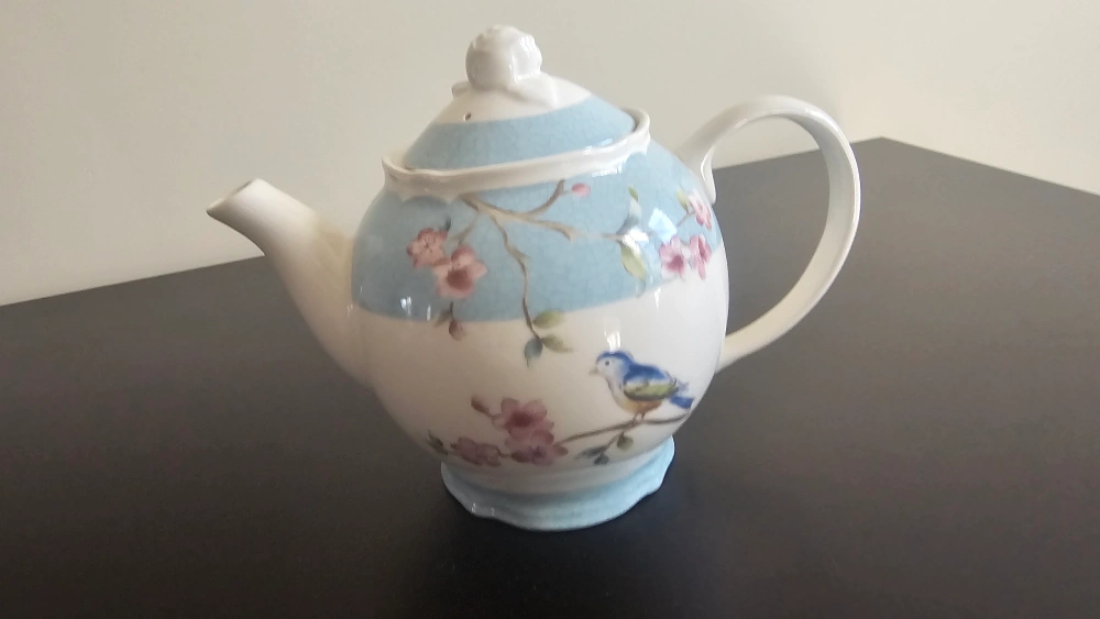 365Selling a lovely teapot with a delicate floral design. It features a beautiful combination of light blue and white colors, accented with pink flowers and a charming bluebird. Perfect for adding a touch of elegance to your tea time