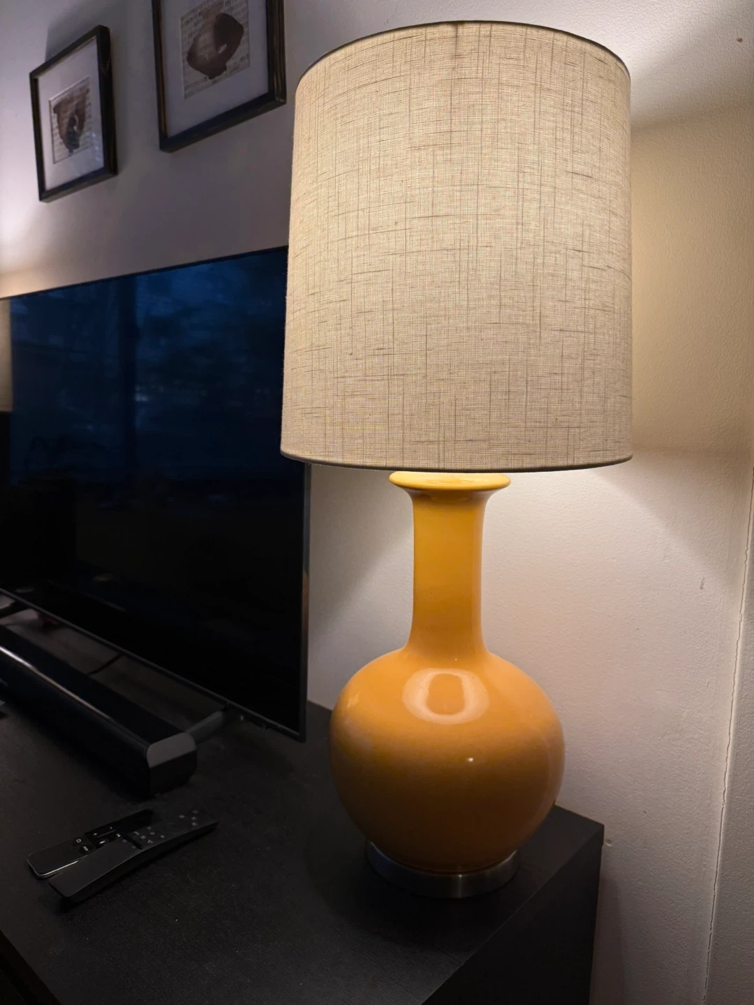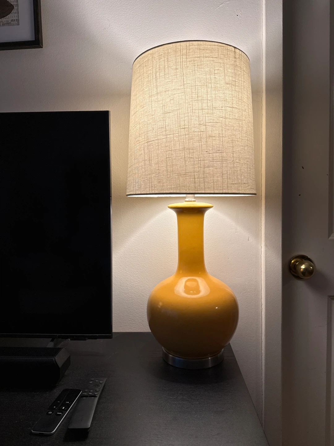 Selling a lovely yellow ceramic table lamp! It has a nice, neutral lampshade and would look great in any room. Size : 26 3/4” tall by about 12”w ( the shade width)