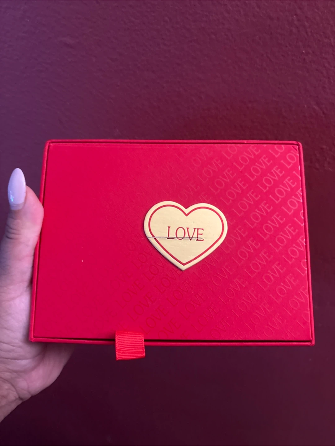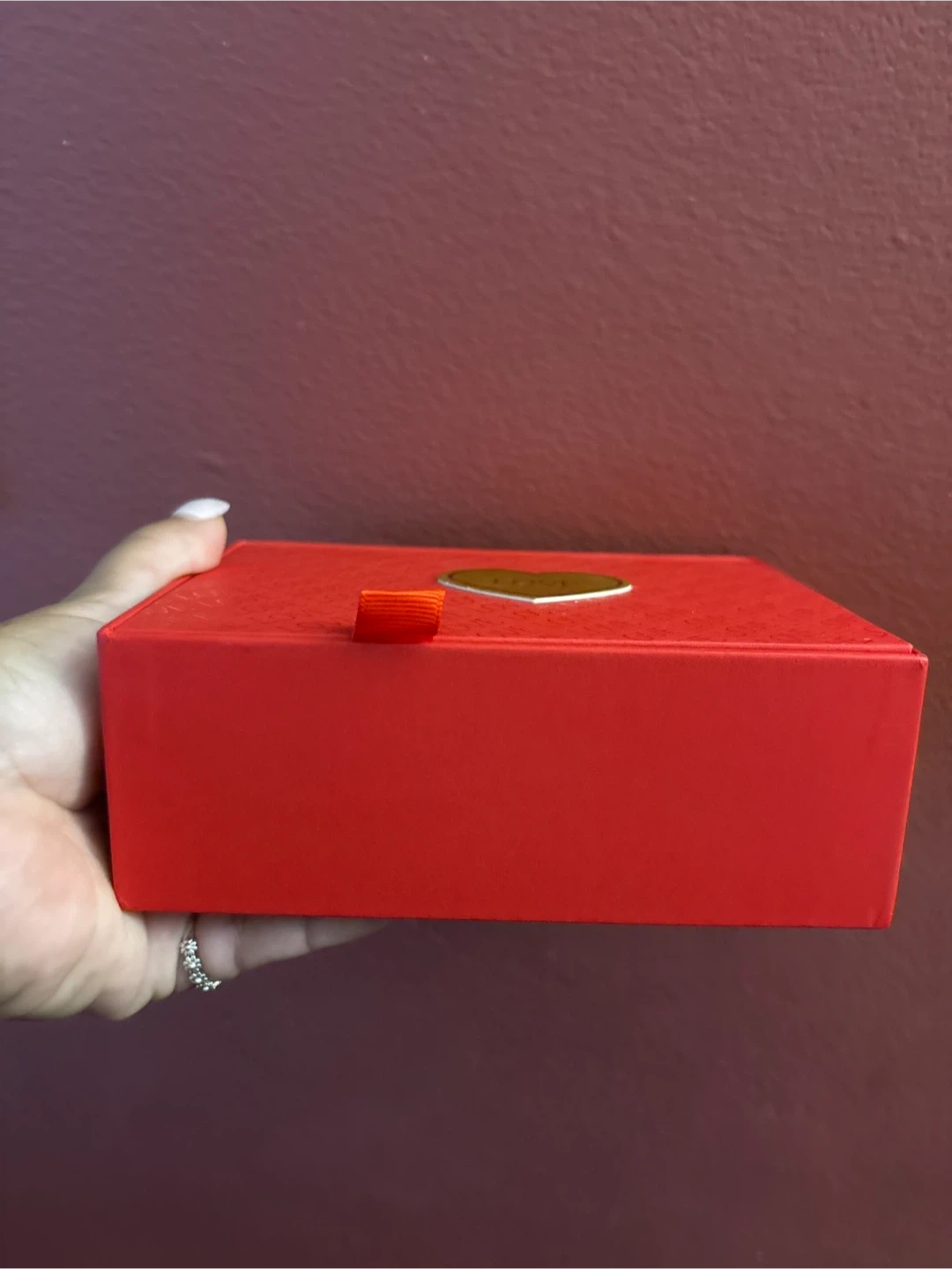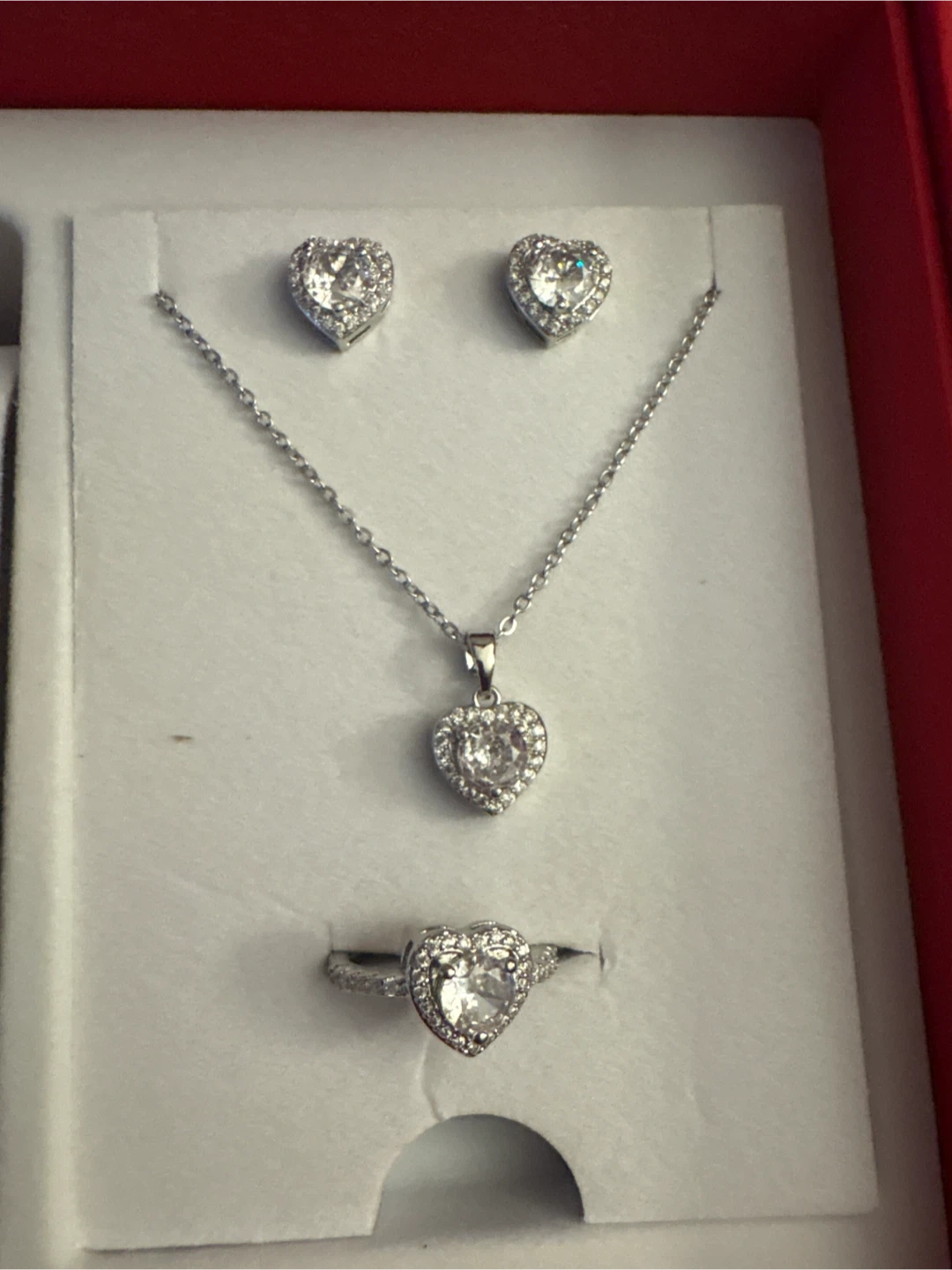1000+This is a beautiful Boccia watch, necklace, earrings, and ring set! It comes in the original box with red roses. The watch has a pink face and a gold band with ruby-colored accents. The necklace, earrings, and ring all have heart-shaped pendants with clear CZ stones. It's a lovely set for a special occasion! NEW
