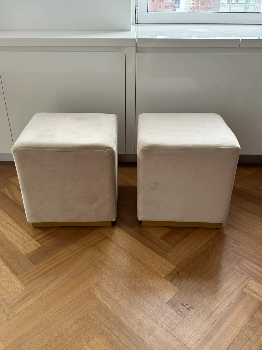 Two Beige Velvet Square Ottomans