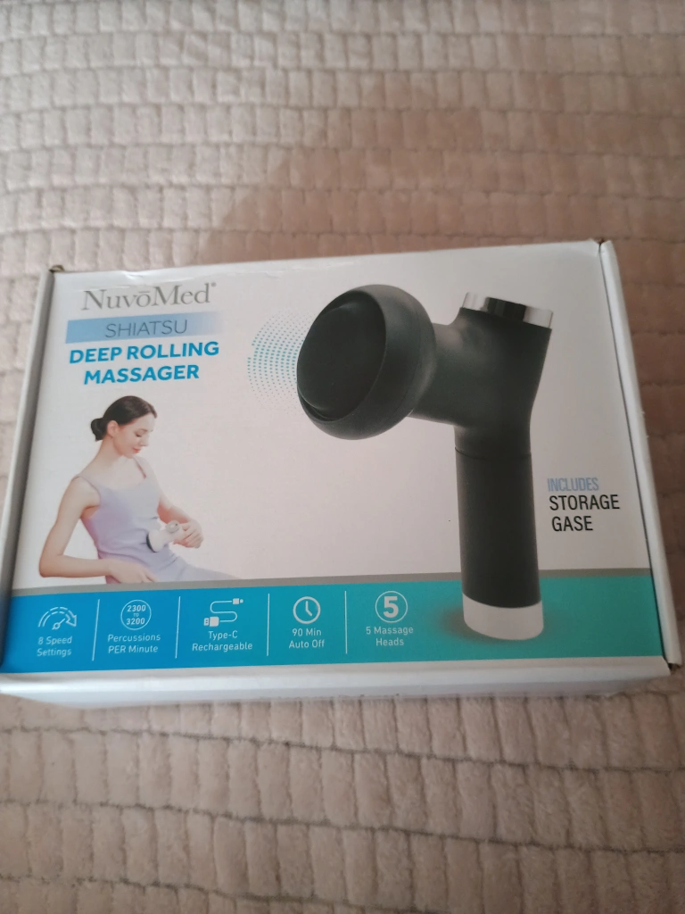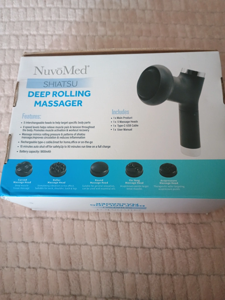 I'm selling a Nuvomed Shiatsu Deep Rolling Massager! It comes with 5 interchangeable heads to target specific body parts. The massager has 8 speed levels and mimics rolling pressure & patterns of shiatsu. It's rechargeable and great for home, office, or on-the-go. It also includes a Type-C cable and user manual