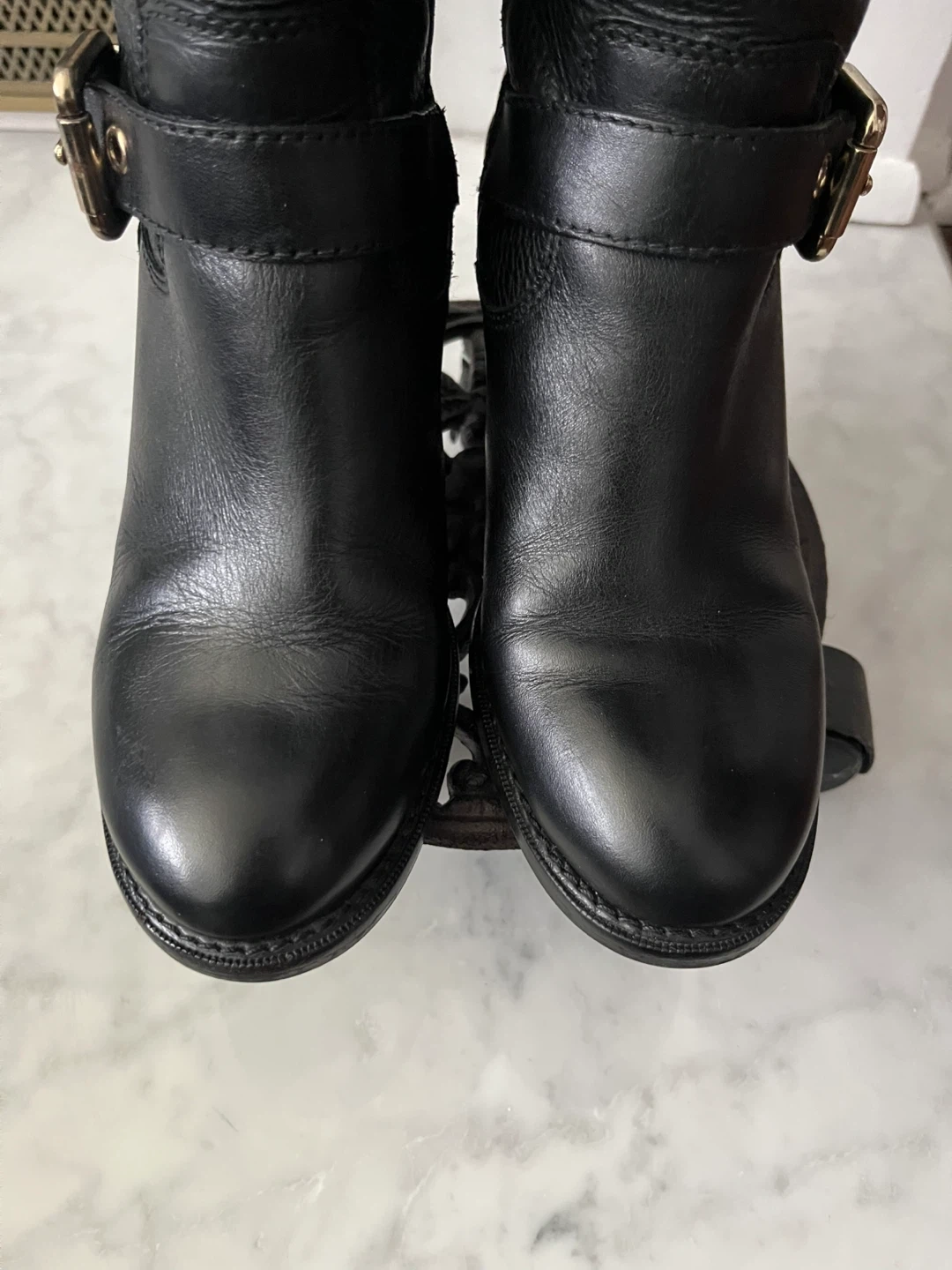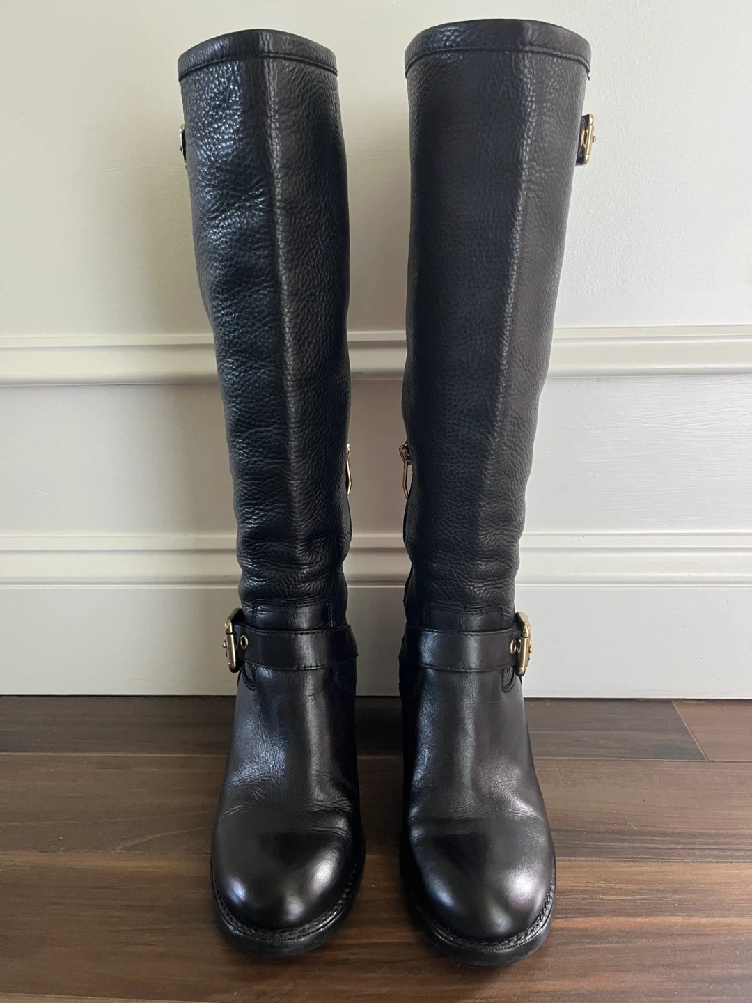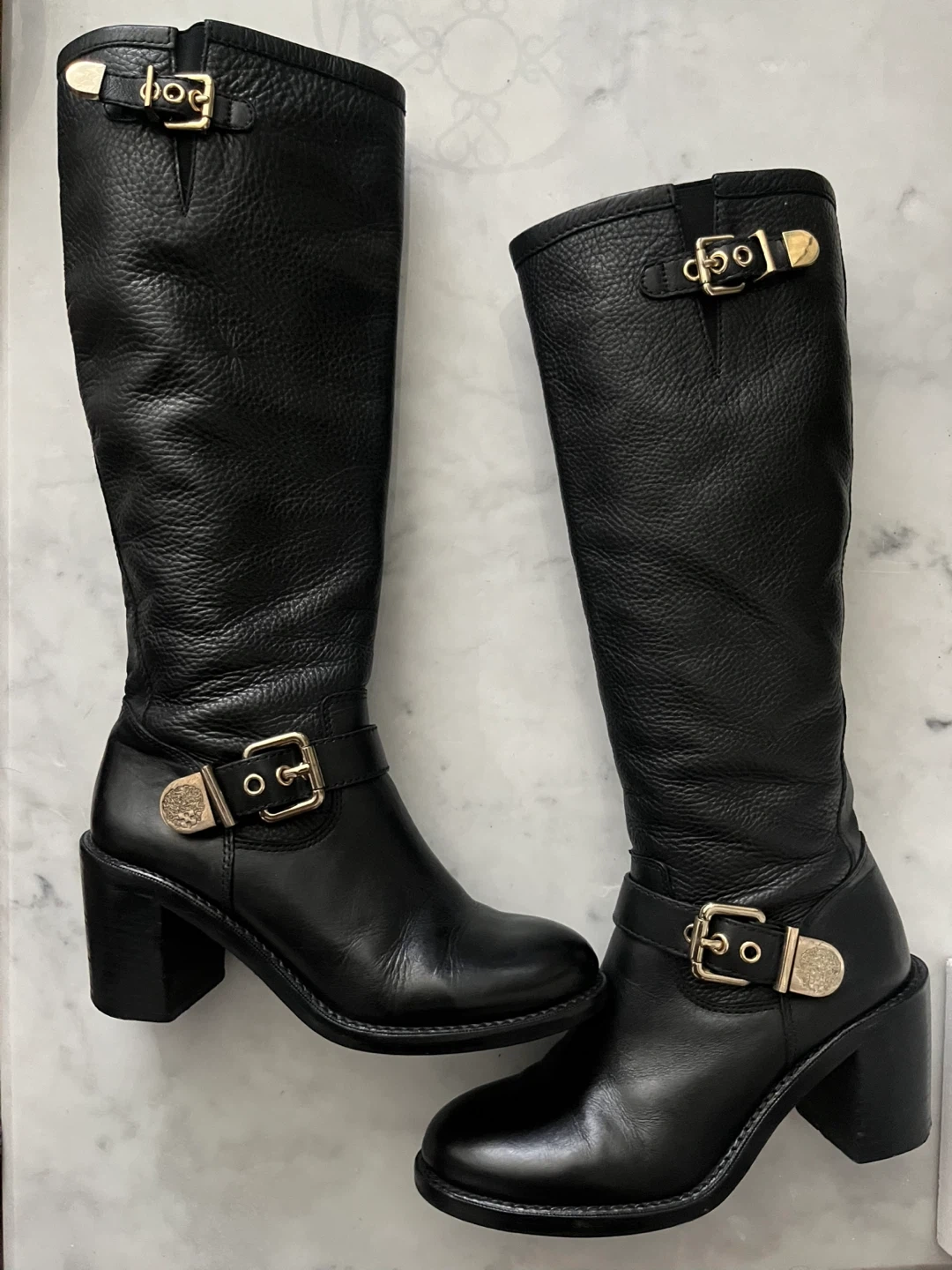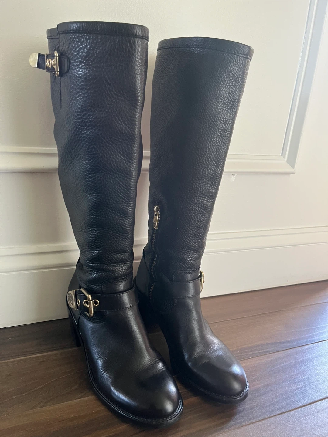 Selling a pair of Vince Camuto boots in black leather. They feature gold-tone hardware and a comfortable 3 inch heel. Great condition.