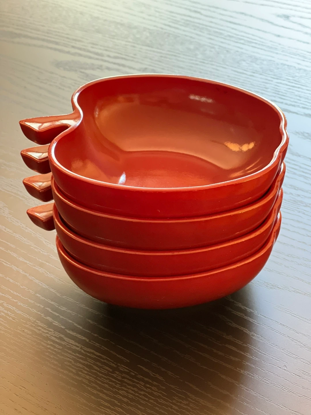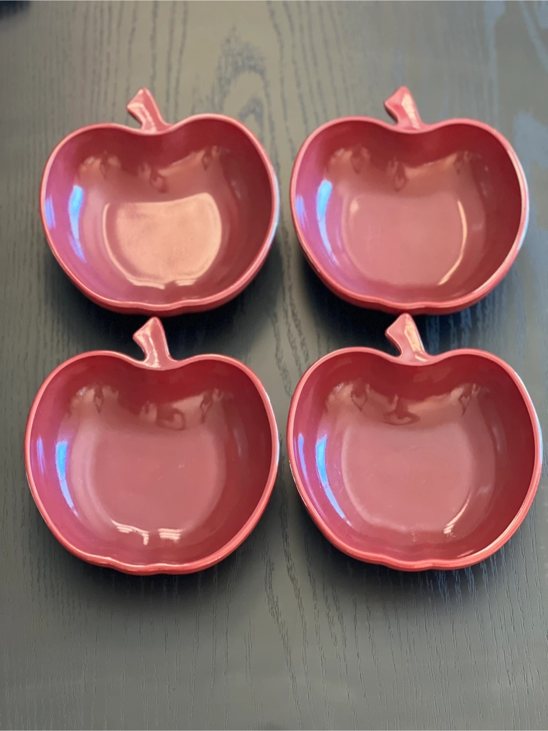 Made by Hazel Atlas as part of their Orchard Blossom series, these bowls are made of sturdy milk glass with a bright, beautiful fired on color in hard-to-find burgundy or maroon. These were made during the 1940's to 1950, during the Colorful Kitchen Glass Movement