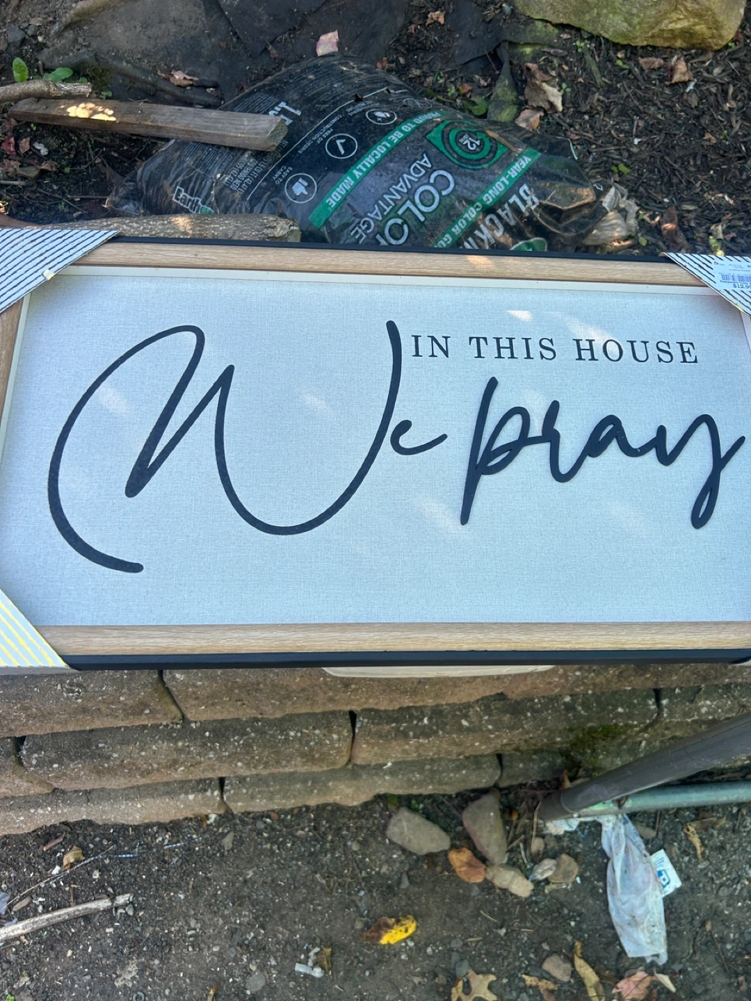 234I'm selling a framed wall decor piece that says "In This House We Pray" in a beautiful script. It would be a lovely addition to any home!