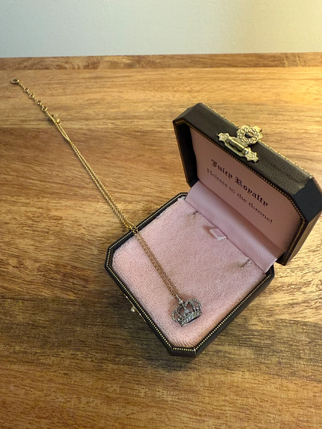 83Selling a super cute Juicy Couture crown necklace! It comes in its original box, perfect for gifting or treating yourself. The crown pendant has a beautiful sparkle, and the gold-tone chain complements it nicely