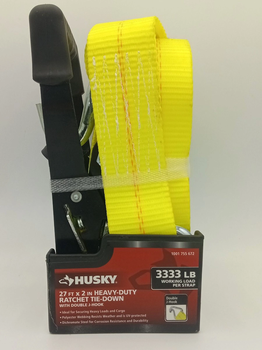 10Selling a Husky 27 ft x 2 in heavy-duty ratchet tie-down with double J-hook. It's ideal for securing heavy loads and cargo. The polyester webbing resists weather and is UV-protected. It also features dichromate steel for corrosion resistance and durability. It has a 3333 lb working load per strap