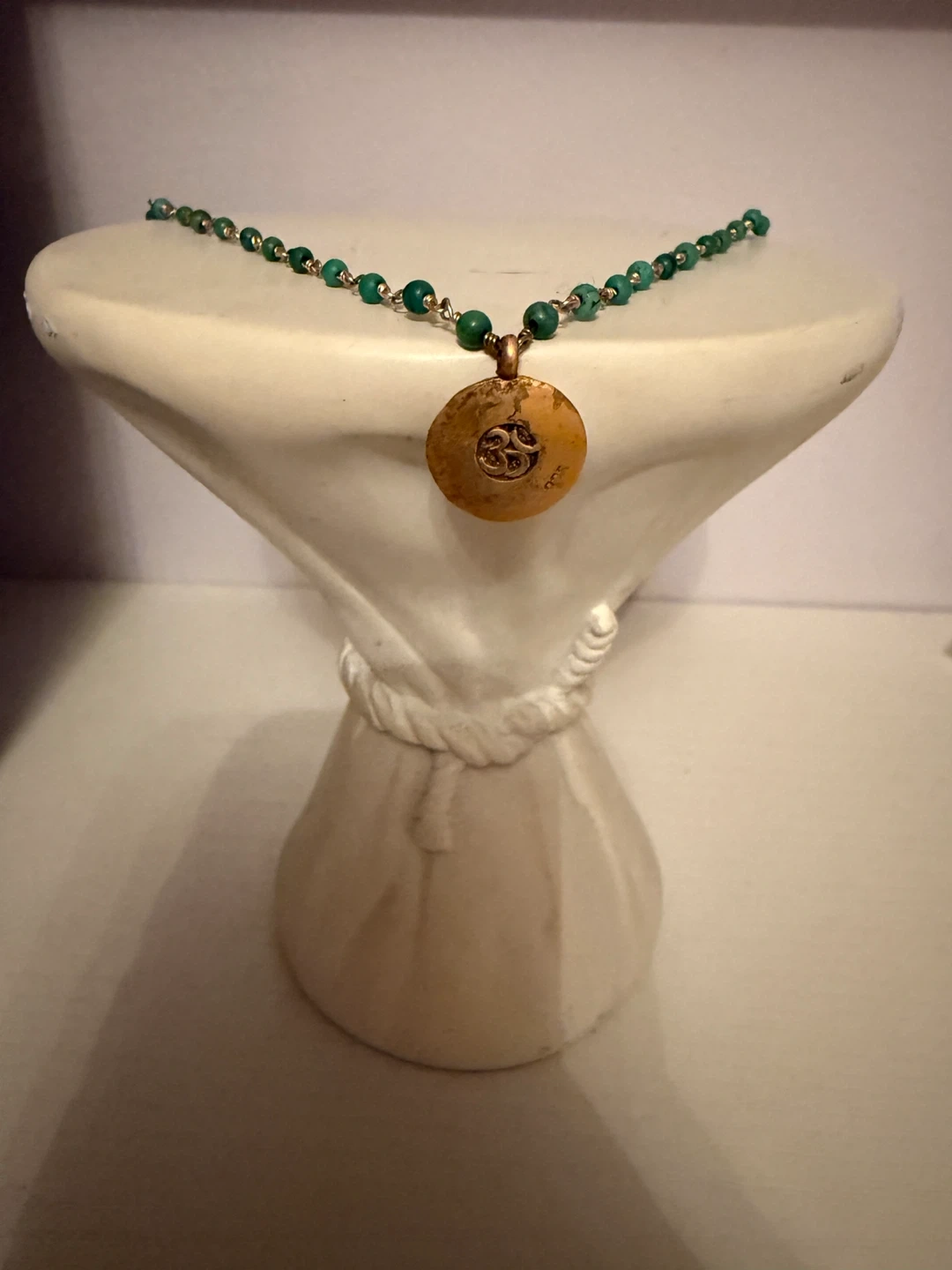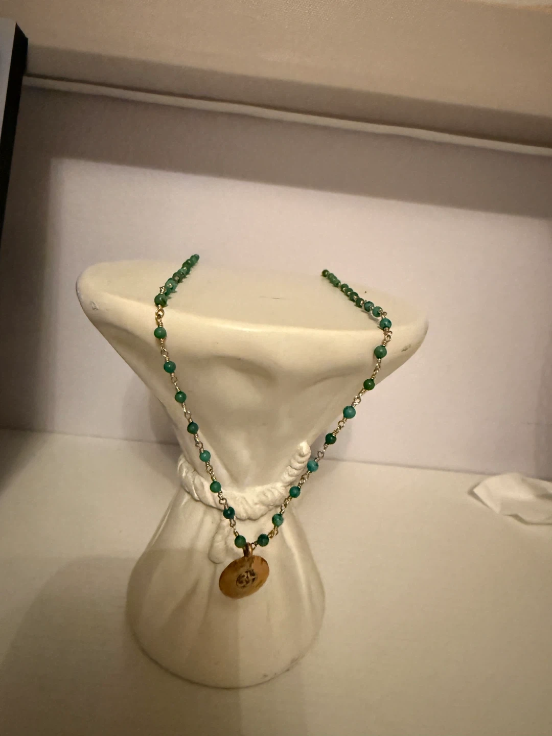 Selling a beautiful turquoise necklace with a 18k gold plated pendant. The beads are a lovely shade of green. It's in great condition and ready for a new home