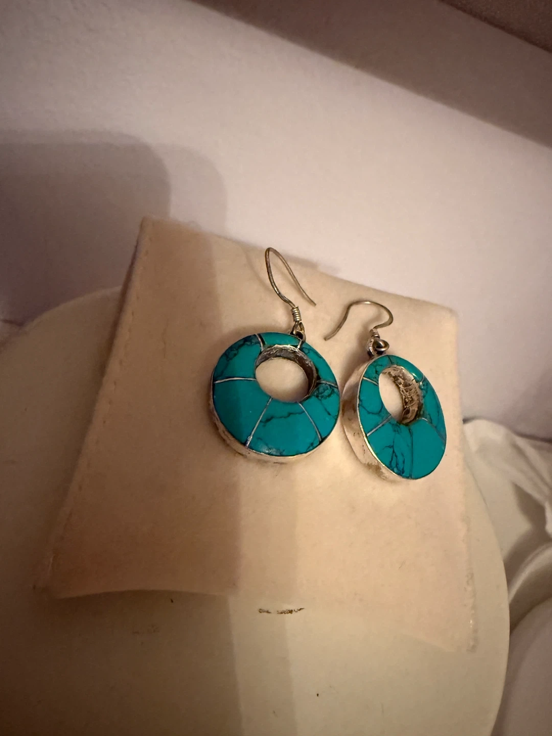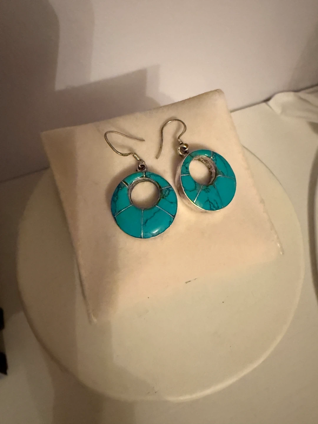 These are a pair of turquoise stone earrings! They're a lovely shade of turquoise and have a unique design. Perfect for adding a pop of color to any outfit