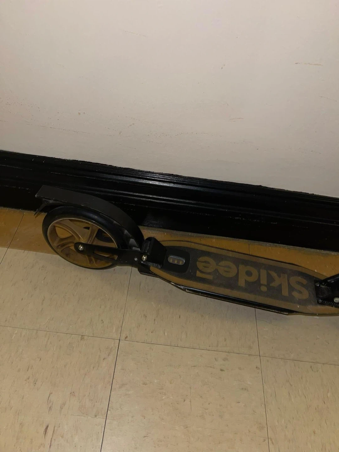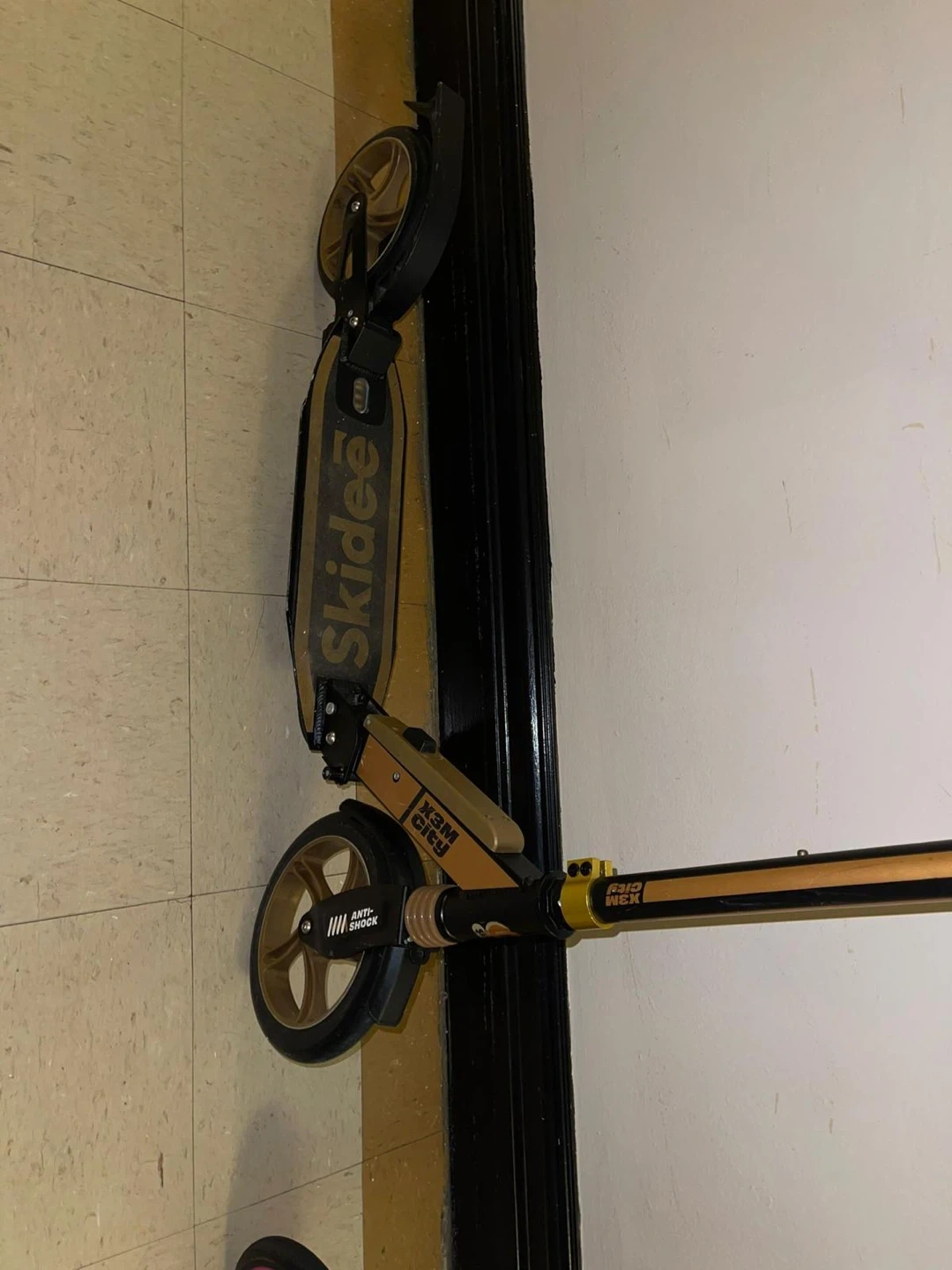 Scooter, specifically the gold-colored version designed for kids, teens, and adults. It features 4 adjustment levels for the handlebar, which can extend up to 41 inches. It is designed for smooth riding with enhanced extra-large 8-inch PU casted wheels and upgraded anti-shock suspension on both wheels. The scooter is foldable, making it convenient for travel and storage. It has a weight capacity of 220 lbs, making it suitable for a wide range of users.