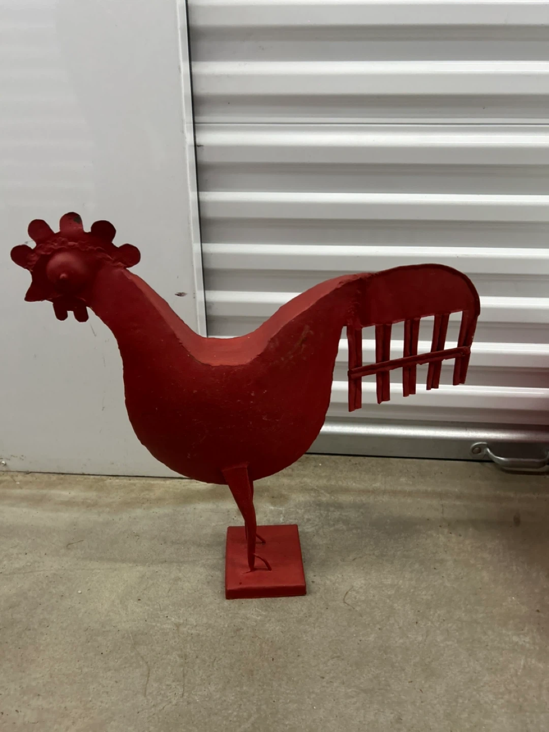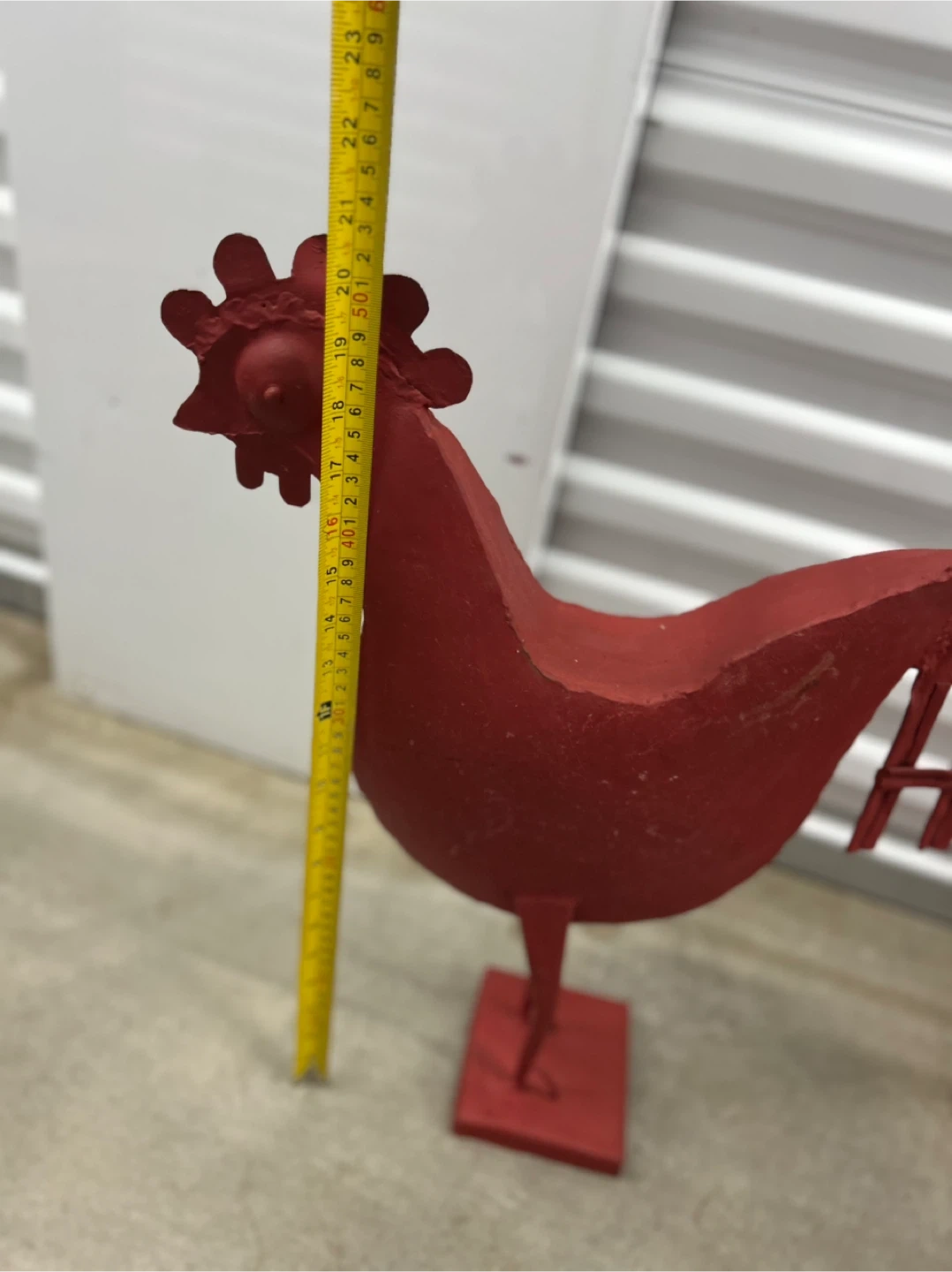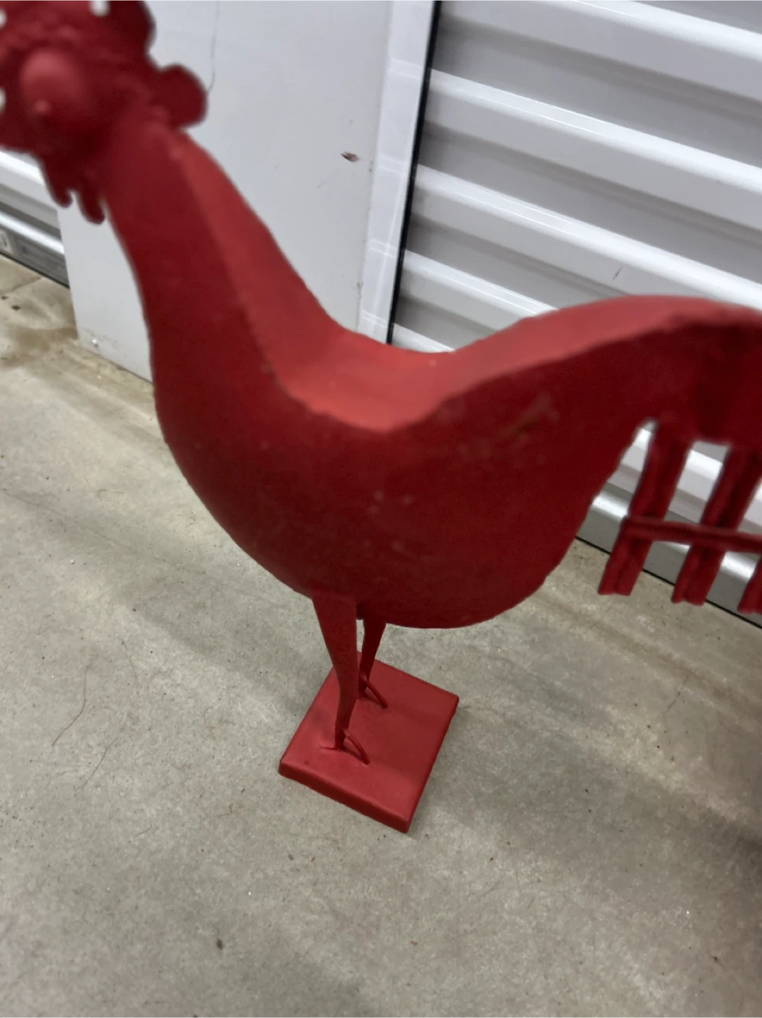 Selling a red metal rooster sculpture! It'would make a fun addition to any garden or home