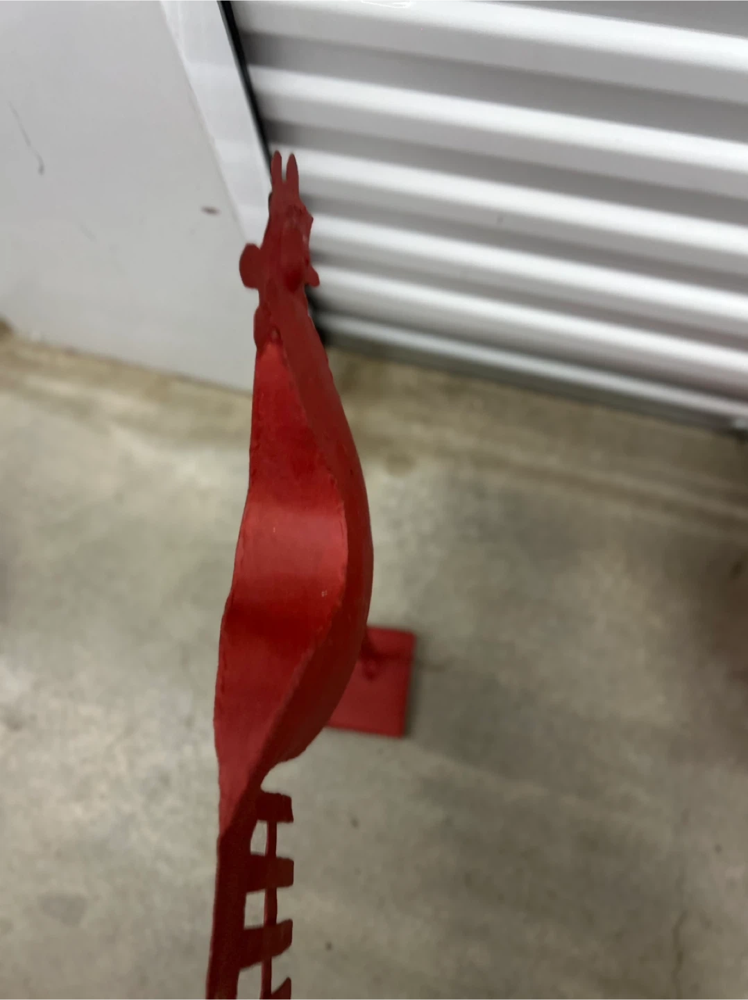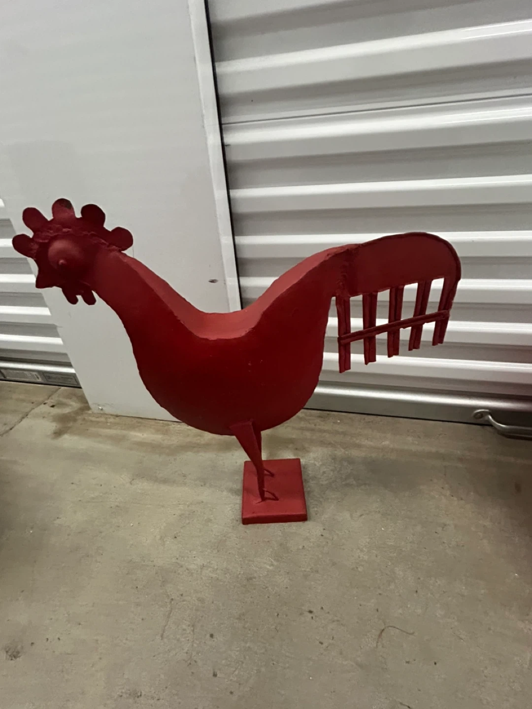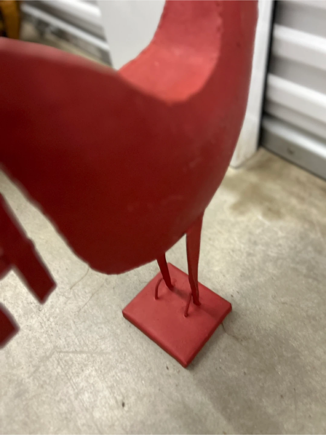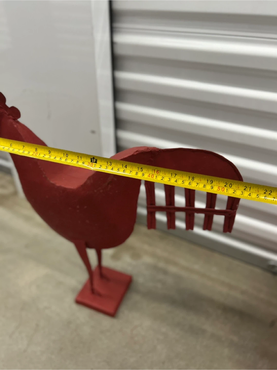 Selling a red metal rooster sculpture! It'would make a fun addition to any garden or home