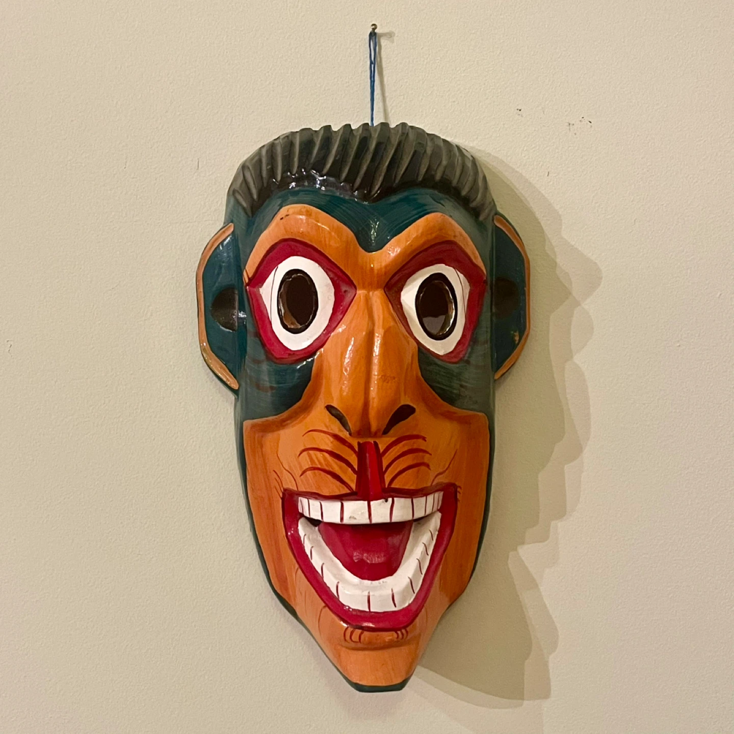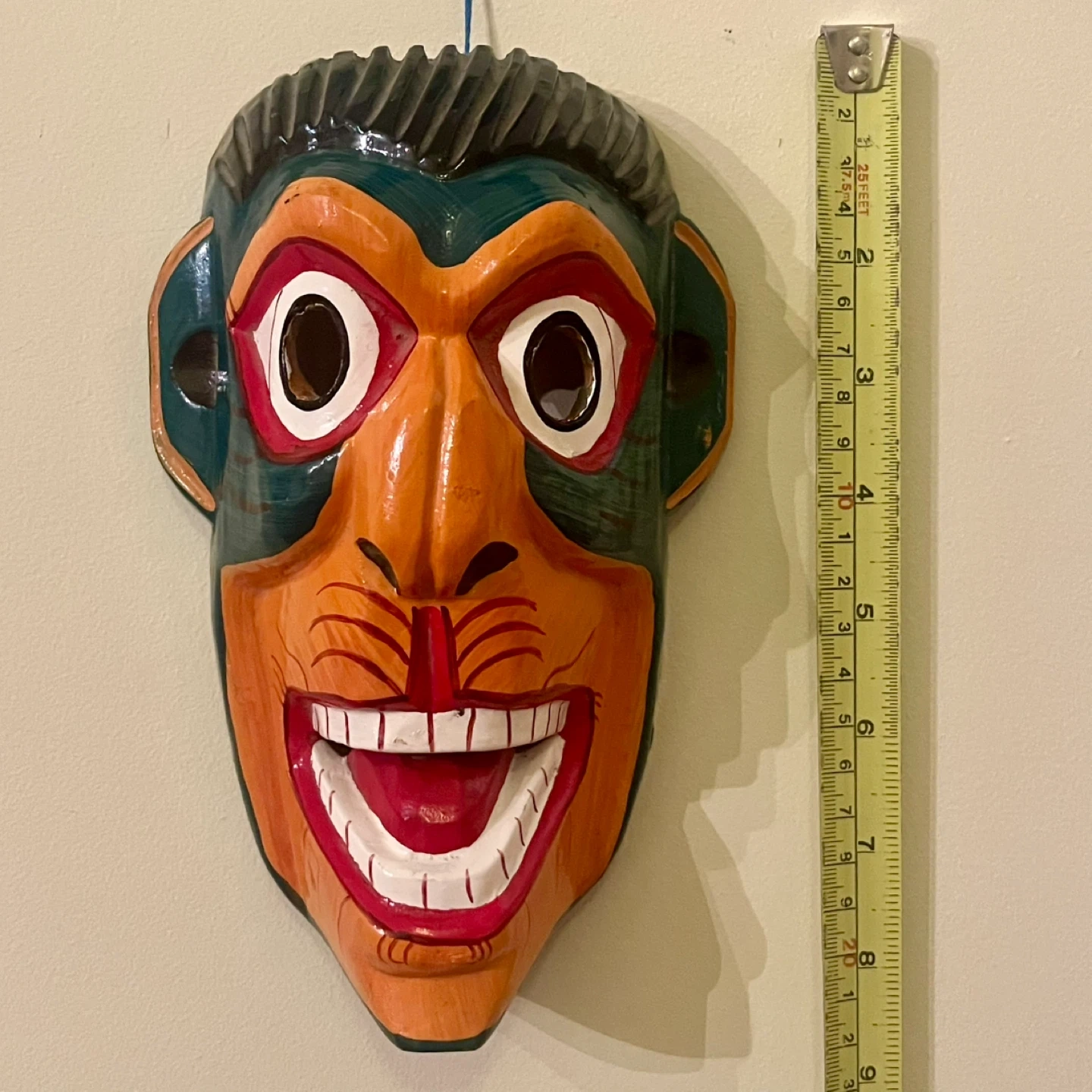 Hand-carved, vibrantly painted Ecuadorian monkey mask. Measures approximately 8 inches in height. Good used condition.