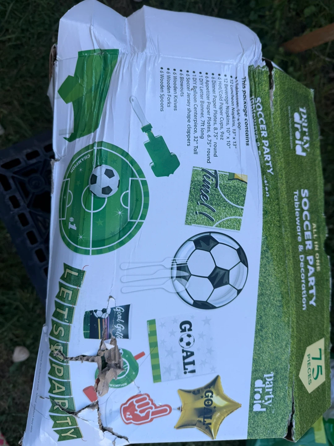 Get ready to celebrate with this all-in-one soccer party kit! It includes everything you need for a fun and festive gathering. The package contains: - 12 luncheon napkins (13" x 13") - 12 beverage napkins (10" x 10") - 8 hot/cold paper cups (9oz) - 8 dinner paper plates (9" round) - 8 dessert paper plates (7" round) - DIY letter centerpiece (7" tall) - 16 single shape clappers - Blowouts - Wooden knives, forks, and spoons
