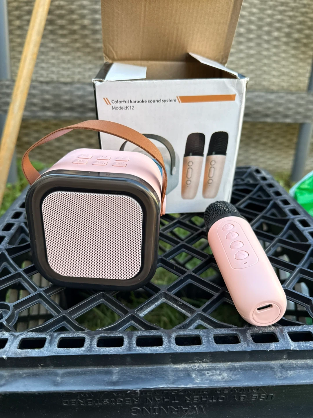 Selling a colorful karaoke sound system, model K12! It comes with the box and includes a microphone. Perfect for some karaoke fun!