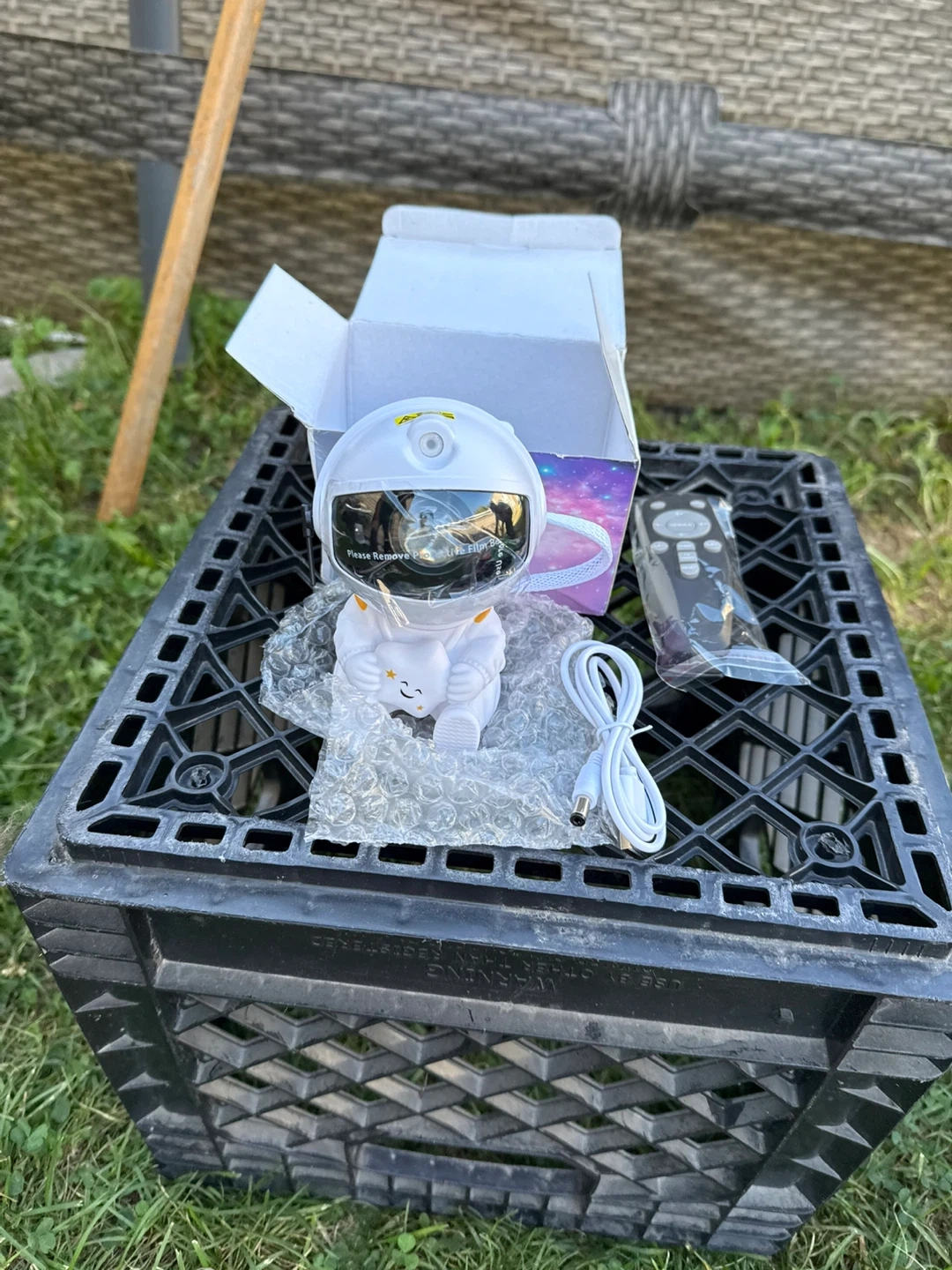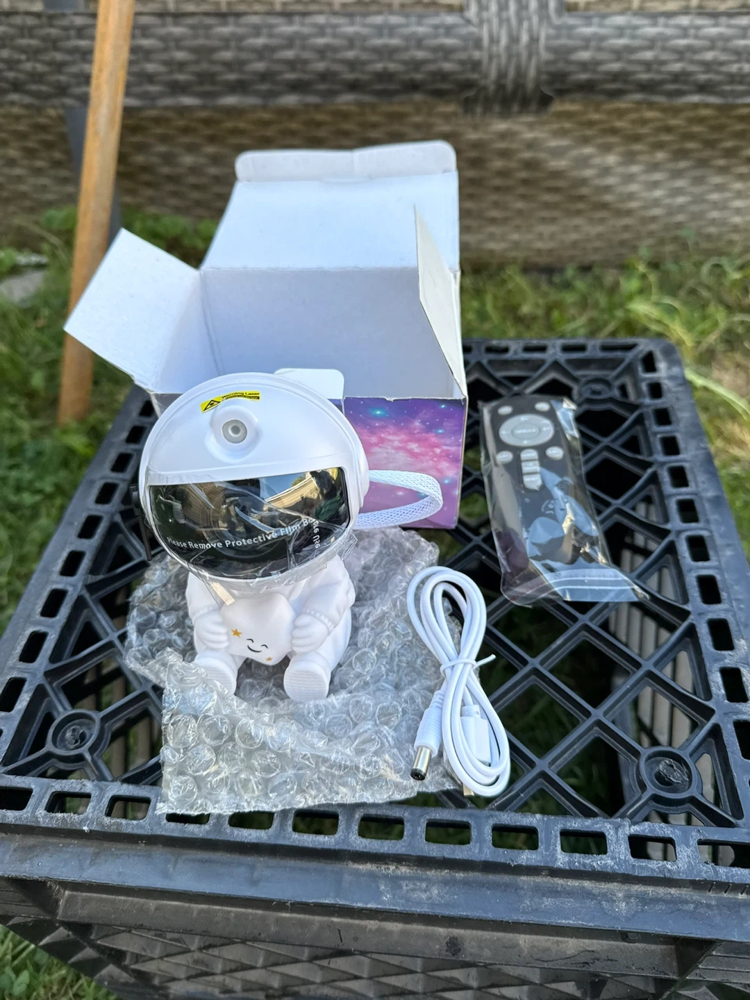 I have a brand new astronaut star projector night light! It comes with the box, a remote, and a USB cable. It's perfect for creating a relaxing and dreamy atmosphere in any room!