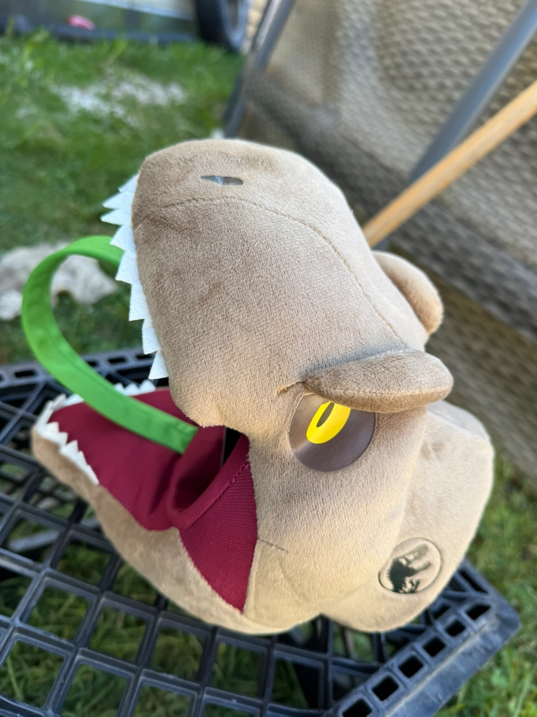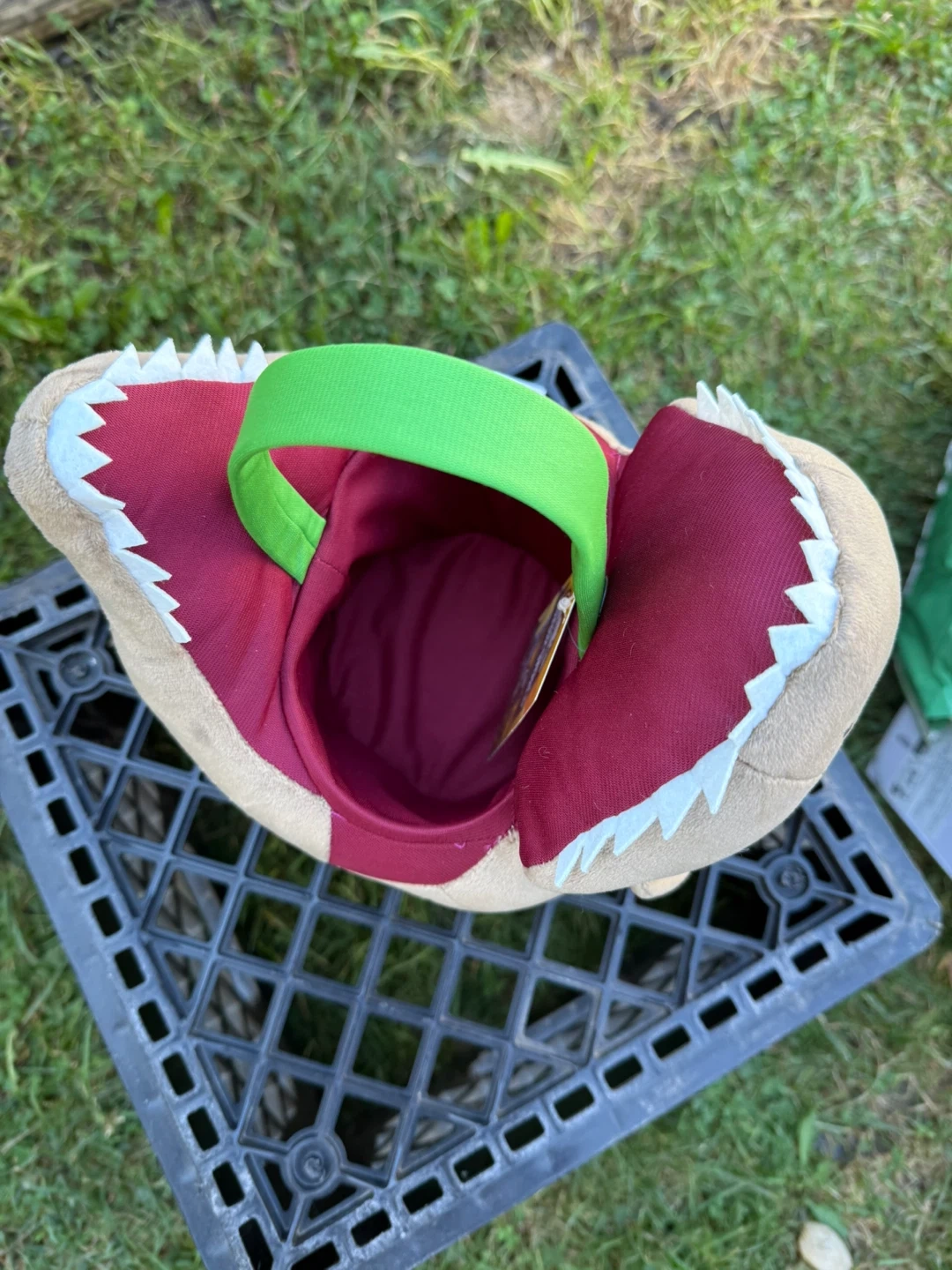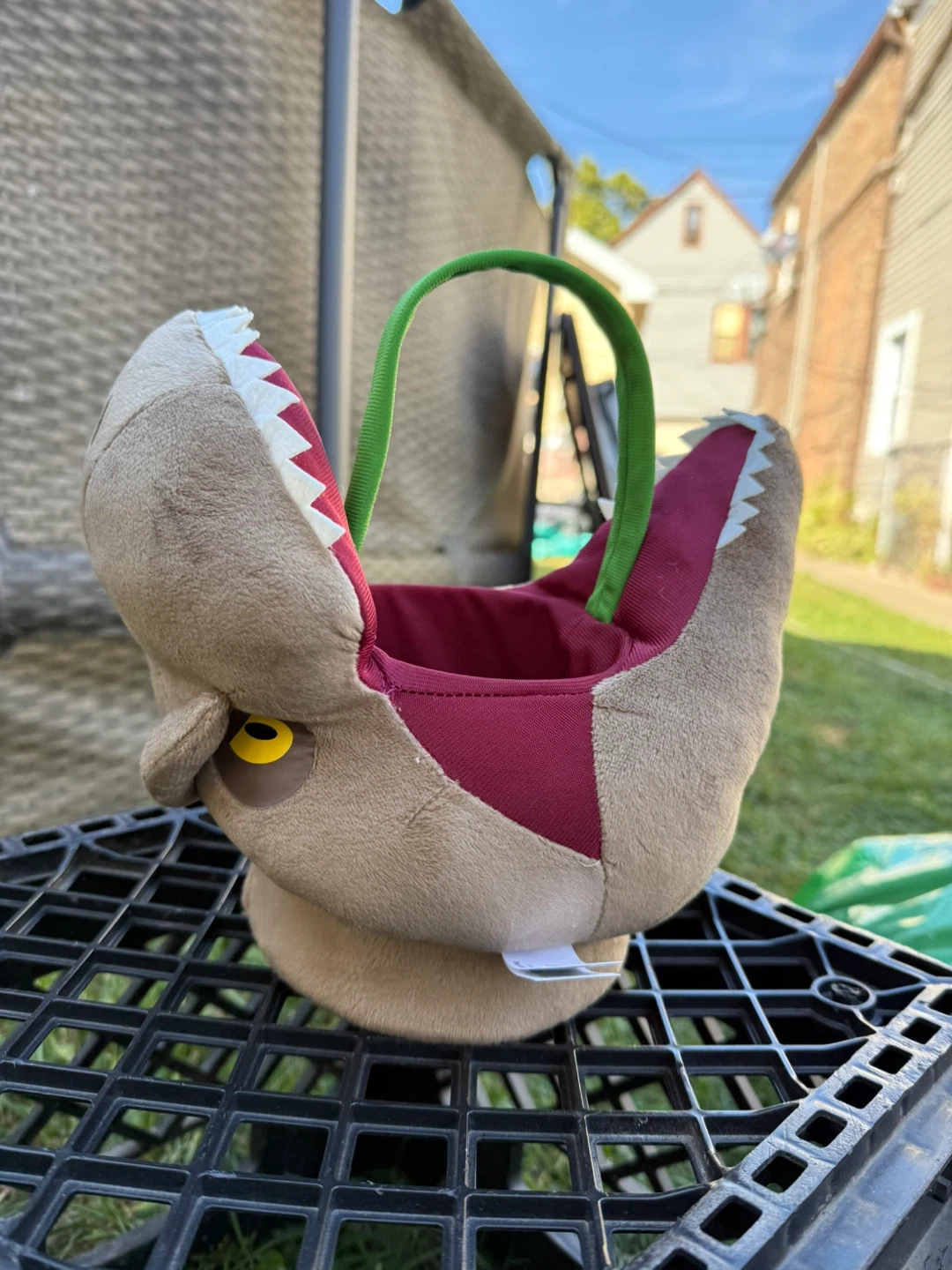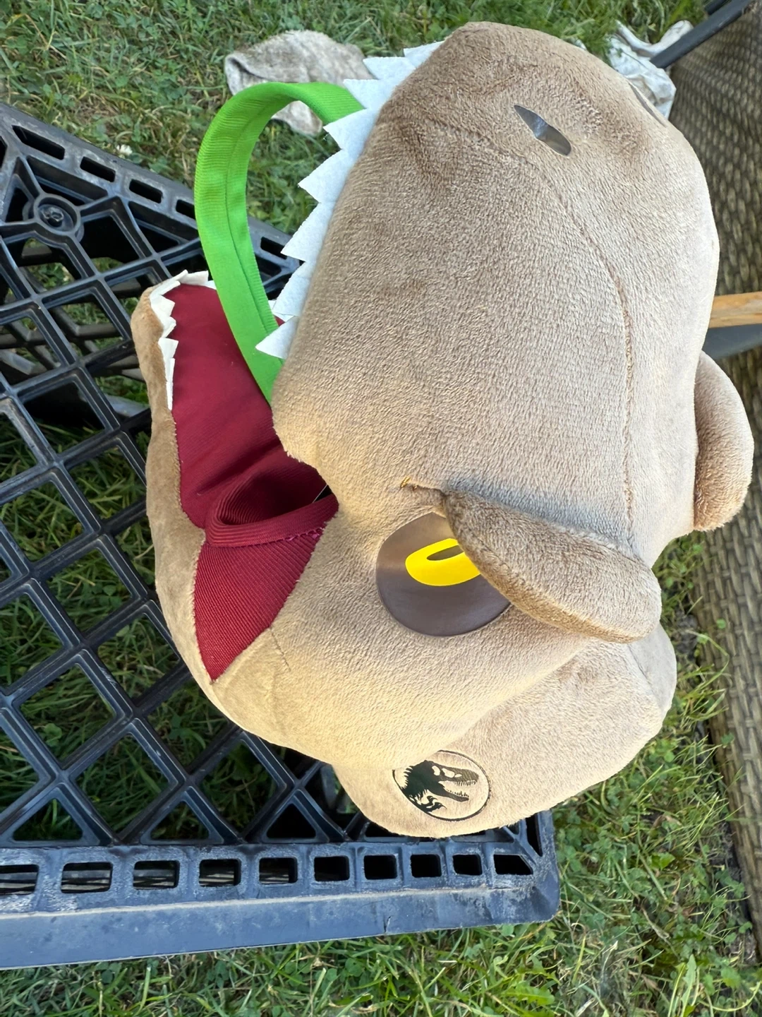Here's a fun Jurassic World dinosaur plush treat bucket! It's shaped like a dinosaur head with a green handle and a red interior. Perfect for collecting treats or just for fun