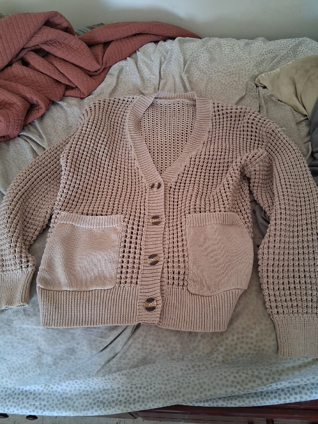 70Selling a cute crochet knit cardigan in a neutral beige color! It's got a lovely open weave and two front pockets. Perfect for layering or wearing on its own during warmer weather. It's in great condition and ready for a new home!